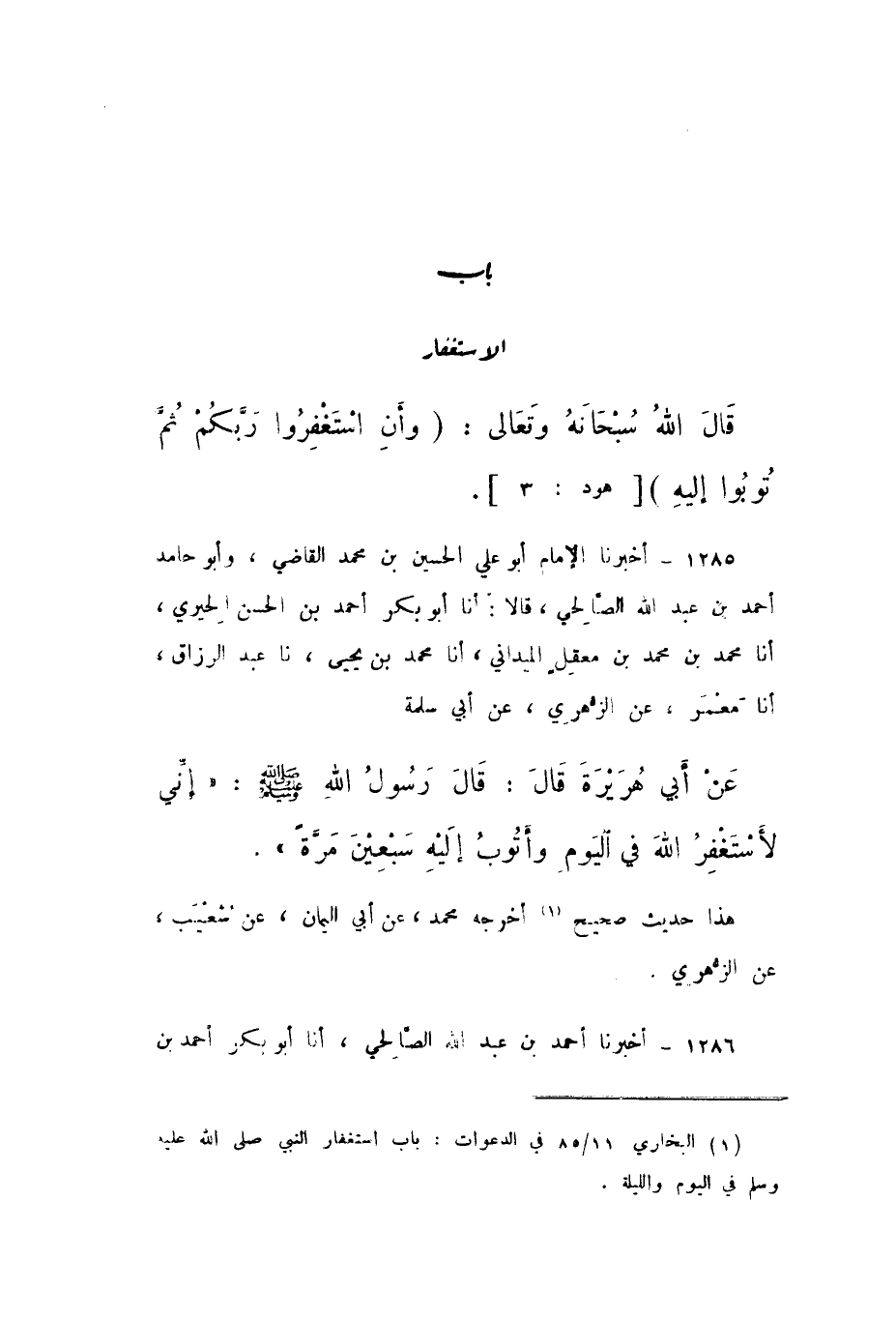 1285 - أَخْبَرَنَا الإِمَامُ أَبُو عَلِيٍّ الْحُسَيْنُ بْنُ مُحَمَّدٍ الْقَاضِي، وَأَبُو حَامِدٍ أَحْمَدُ بْنُ عَبْدِ اللَّهِ الصَّالِحِيُّ، قَالا: أَنا أَبُو بَكْرٍ أَحْمَدُ بْنُ الْحَسَنِ الْحِيرِيُّ، أَنا مُحَمَّدُ بْنُ مُحَمَّدِ بْنِ مَعْقِلٍ الْمَيْدَانِيُّ، أَنا مُحَمَّدُ بْنُ يَحْيَى، نَا عَبْدُ الرَّزَّاقِ، أَنا مَعْمَرٌ، عَنِ الزُّهْرِيِّ، عَنْ أَبِي سَلَمَةَ، عَنْ أَبِي هُرَيْرَةَ، قَالَ: قَالَ رَسُولُ اللَّهِ صَلَّى اللهُ عَلَيْهِ وَسَلَّمَ: «إِنِّي لأَسْتَغْفِرُ اللَّهَ فِي الْيَوْمِ وَأَتُوبُ إِلَيْهِ سَبْعِينَ مَرَّةً».