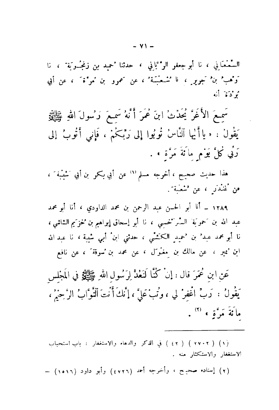 1289 - أَنا أَبُو الْحَسَنِ عَبْدُ الرَّحْمَنِ بْنُ مُحَمَّدٍ الدَّاوُدِيُّ، أَنا أَبُو مُحَمَّدٍ عَبْدُ اللَّهِ بْنُ حَمُّوَيْهِ السَّرَخْسِيُّ، نَا أَبُو إِسْحَاقَ إِبْرَاهِيمُ بْنُ خُزَيْمٍ الشَّاشِيُّ، نَا أَبُو مُحَمَّدٍ عَبْدُ بْنُ حُمَيْدٍ الْكَشِّيُّ، حَدَّثَنِي ابْنُ أَبِي شَيْبَةَ، نَا عَبْدُ اللَّهِ بْنُ نُمَيْرٍ، عَنْ مَالِكِ بْنِ مِغْوَلٍ، عَنْ مُحَمَّدِ بْنِ سُوقَةَ، عَنْ نَافِعٍ، عَنِ ابْنِ عُمَرَ، قَالَ: إِنْ كُنَّا لَنَعُدُّ لِرَسُولِ اللَّهِ صَلَّى اللهُ عَلَيْهِ وَسَلَّمَ فِي الْمَجْلِسِ، يَقُولُ: «رَبِّ اغْفِرْ لِي، وَتُبْ عَلَيَّ، إِنَّكَ أَنْتَ التَّوَّابُ الرَّحِيمُ، مِائَةَ مَرَّةٍ».