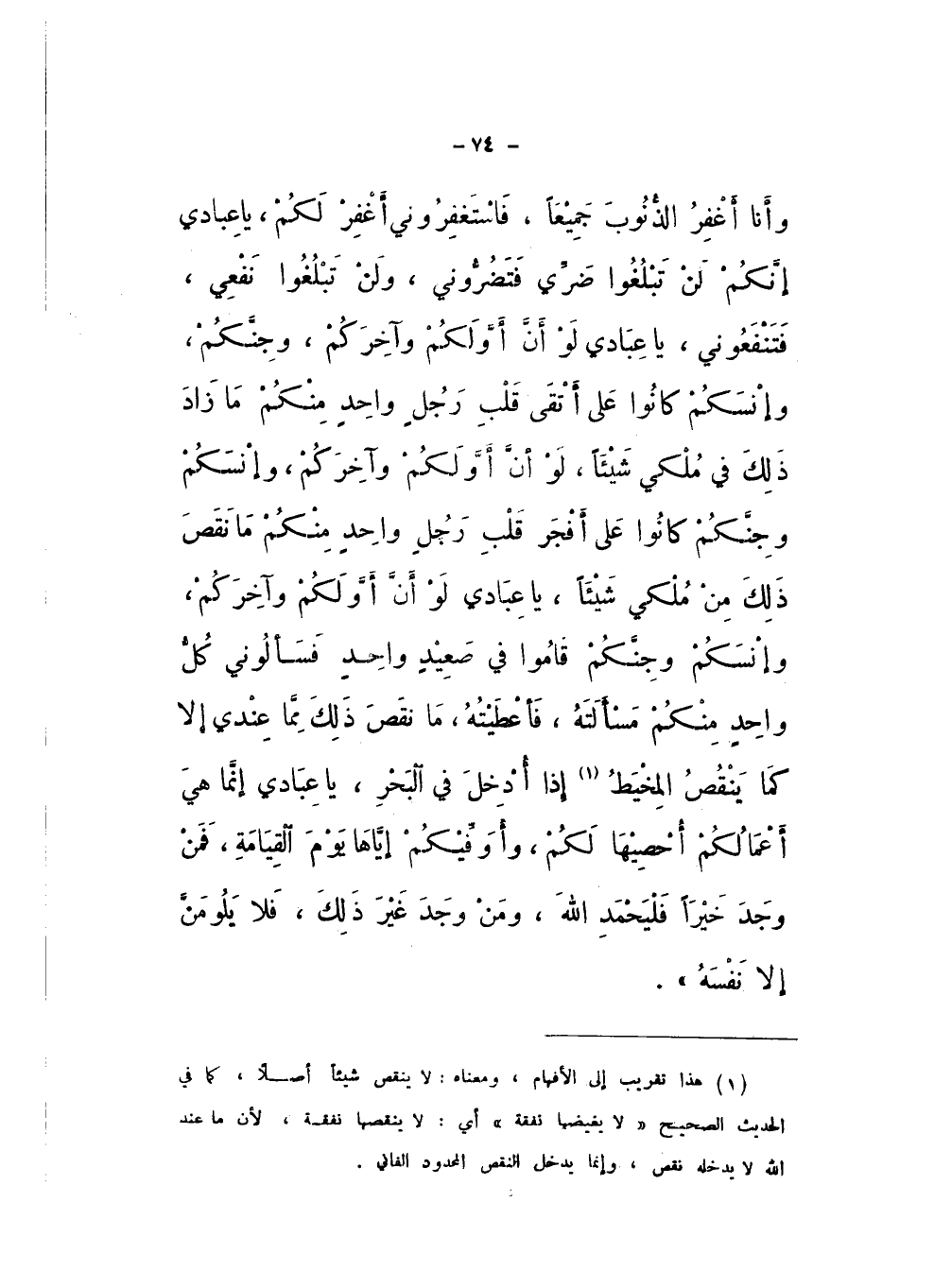 وَأَنَا أَغْفِرُ الذُّنُوبَ جَمِيعًا، فَاسْتَغْفِرُونِي أَغْفِرْ لَكُمْ، يَا عِبَادِي إِنَّكُمْ لَنْ تَبْلُغُوا ضَرِّي فَتَضُرُّونِي، وَلَنْ تَبْلُغُوا نَفْعِي فَتَنْفَعُونِي، يَا عِبَادِي لَوْ أَنَّ أَوَّلَكُمْ وَآخِرَكُمْ، وَجِنَّكُمْ وَإِنْسَكُمْ، كَانُوا عَلَى أَتْقَى قَلْبِ رَجُلٍ وَاحِدٍ مِنْكُمْ , مَا زَادَ ذَلِكَ فِي مُلْكِي شَيْئًا، لَوْ أَنَّ أَوَّلَكُمْ وَآخِرَكُمْ، وَإِنْسَكُمْ وَجِنَّكُمْ، كَانُوا عَلَى أَفْجَرِ قَلْبِ رَجُلٍ وَاحِدٍ مِنْكُمْ , مَا نَقَصَ ذَلِكَ مِنْ مُلْكِي شَيْئًا، يَا عِبَادِي لَوْ أَنَّ أَوَّلَكُمْ وَآخِرَكُمْ، وَإِنْسَكُمْ وَجِنَّكُمْ، قَامُوا فِي صَعِيدٍ وَاحِدٍ فَسَأَلُونِي كُلُّ وَاحِدٍ مِنْكُمْ مَسْأَلَتَهُ، فَأَعْطَيْتُهُ، مَا نَقَصَ ذَلِكَ مِمَّا عِنْدِي , إِلا كَمَا يَنْقُصُ الْمِخْيَطُ إِذَا أُدْخِلَ فِي الْبَحْرِ، يَا عِبَادِي إِنَّمَا هِيَ أَعْمَالُكُمْ أُحْصِيهَا لَكُمْ، وَأُوَفِّيكُمْ إِيَّاهَا يَوْمَ الْقِيَامَةِ، فَمَنْ وَجَدَ خَيْرًا فَلْيَحْمَدِ اللَّهَ، وَمَنْ وَجَدَ غَيْرَ ذَلِكَ، فَلا يَلُومَنَّ إِلا نَفْسَهُ».