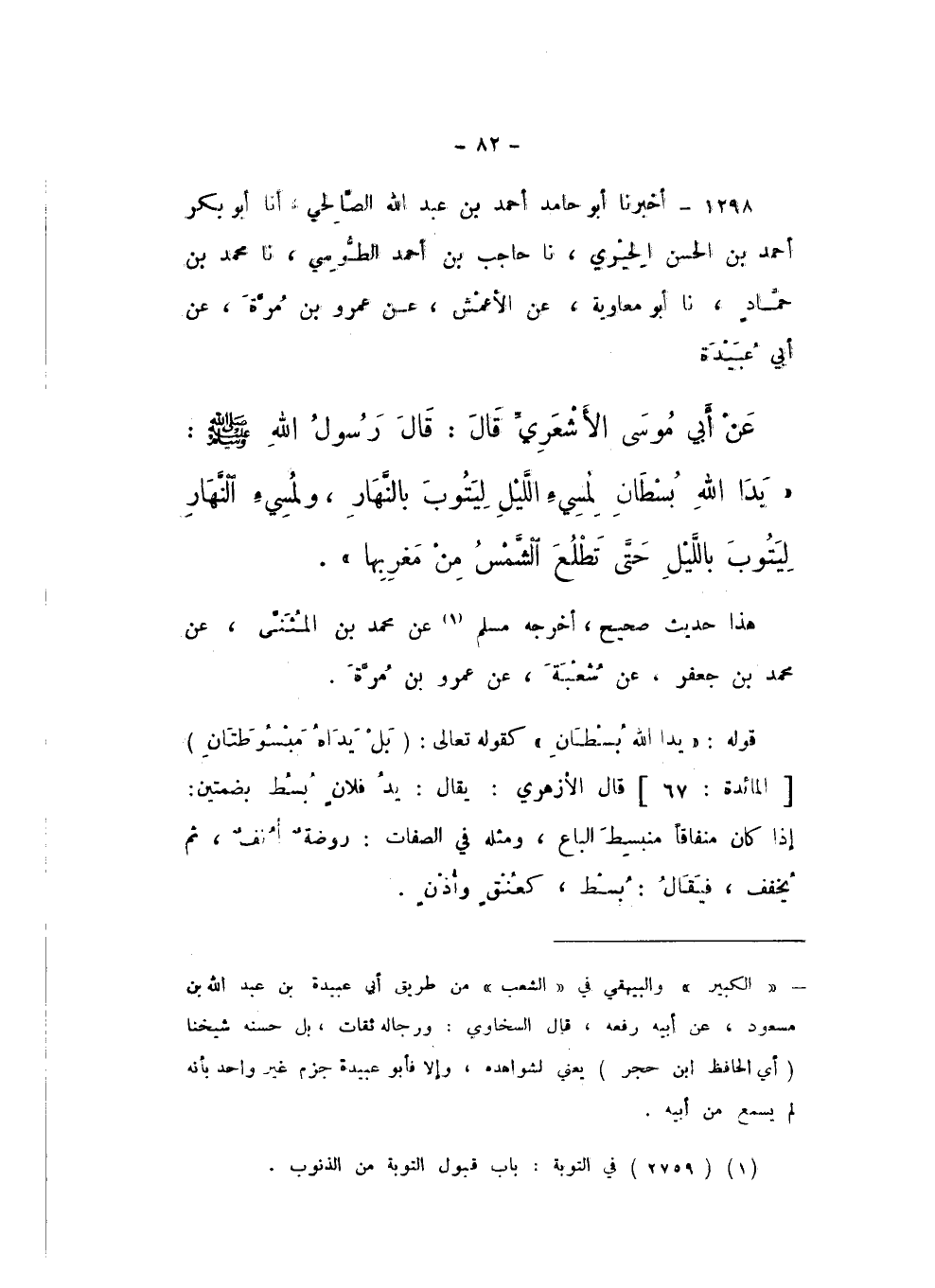 1298 - أَخْبَرَنَا أَبُو حَامِدٍ أَحْمَدُ بْنُ عَبْدِ اللَّهِ الصَّالِحِيُّ، أَنا أَبُو بَكْرٍ أَحْمَدُ بْنُ الْحَسَنِ الْحِيرِيُّ، نَا حَاجِبُ بْنُ أَحْمَدَ الطُّوسِيُّ، نَا مُحَمَّدُ بْنُ حَمَّادٍ، نَا أَبُو مُعَاوِيَةَ، عَنِ الأَعْمَشِ، عَنْ عَمْرِو بْنِ مُرَّةَ، عَنْ أَبِي عُبَيْدَةَ، عَنْ أَبِي مُوسَى الأَشْعَرِيِّ، قَالَ: قَالَ رَسُولُ اللَّهِ صَلَّى اللهُ عَلَيْهِ وَسَلَّمَ: «يَدَا اللَّهِ بُسْطَانِ لِمُسِيءِ اللَّيْلِ، لِيَتُوبَ بِالنَّهَارِ، وَلِمُسِيءِ النَّهَارِ، لِيَتُوبَ بِاللَّيْلِ حَتَّى تَطْلُعَ الشَّمْسُ مِنْ مَغْرِبِهَا».