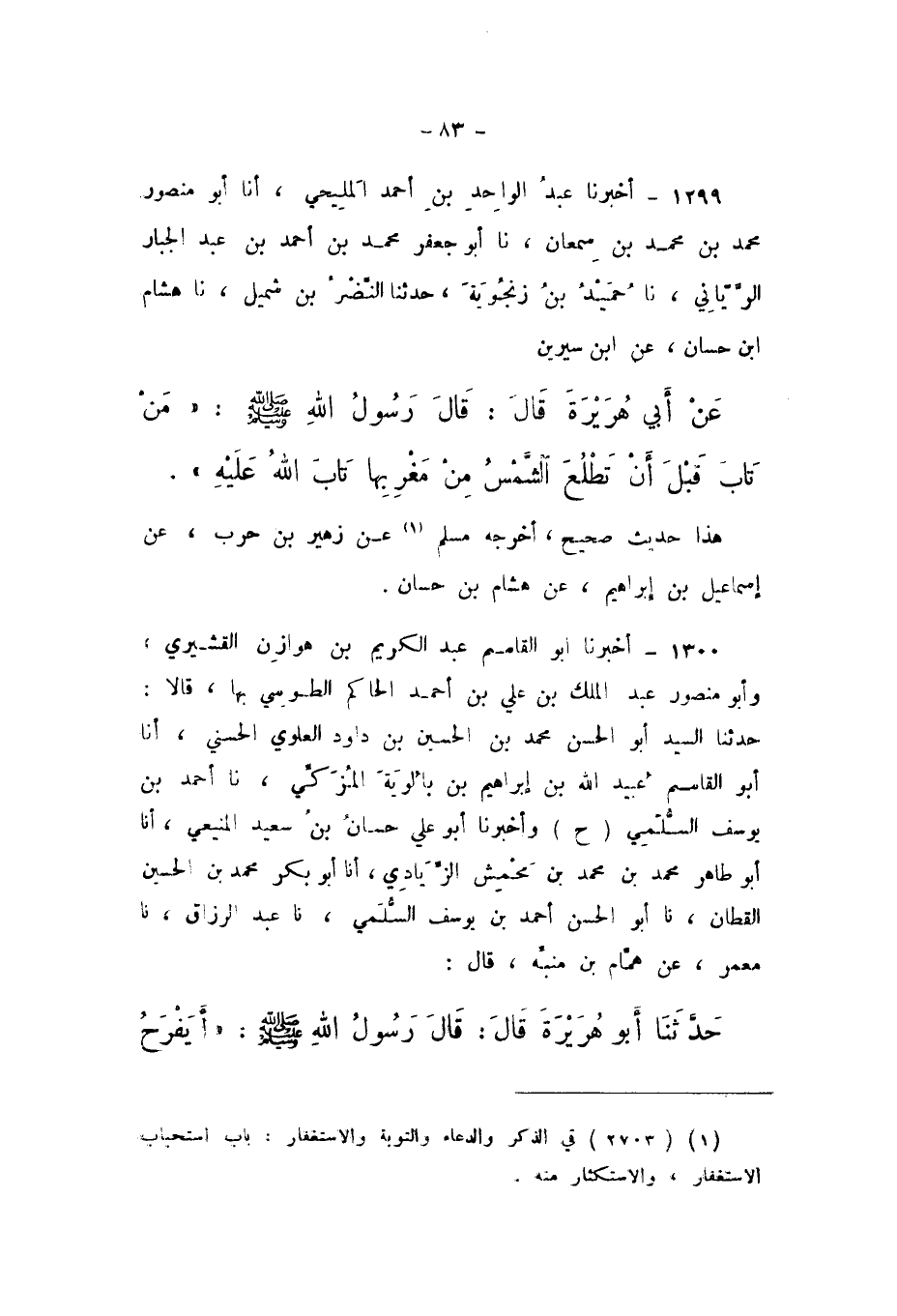 1299 - أَخْبَرَنَا عَبْدُ الْوَاحِدِ بْنُ أَحْمَدَ الْمَلِيحِيُّ، أَنا أَبُو مَنْصُورٍ مُحَمَّدُ بْنُ مُحَمَّدِ بْنِ سَمْعَانَ، نَا أَبُو جَعْفَرٍ مُحَمَّدُ بْنُ أَحْمَدَ بْنِ عَبْدِ الْجَبَّارِ الرَّيَّانِيُّ، نَا حُمَيْدُ بْنُ زَنْجُوَيْهِ، حَدَّثَنَا النَّضْرُ بْنُ شُمَيْلٍ، نَا هِشَامُ بْنُ حَسَّانٍ، عَنِ ابْنِ سِيرِينَ، عَنْ أَبِي هُرَيْرَةَ، قَالَ: قَالَ رَسُولُ اللَّهِ صَلَّى اللهُ عَلَيْهِ وَسَلَّمَ: «مَنْ تَابَ قَبْلَ أَنْ تَطْلُعَ الشَّمْسُ مِنْ مَغْرِبِهَا تَابَ اللَّهُ عَلَيْهِ».