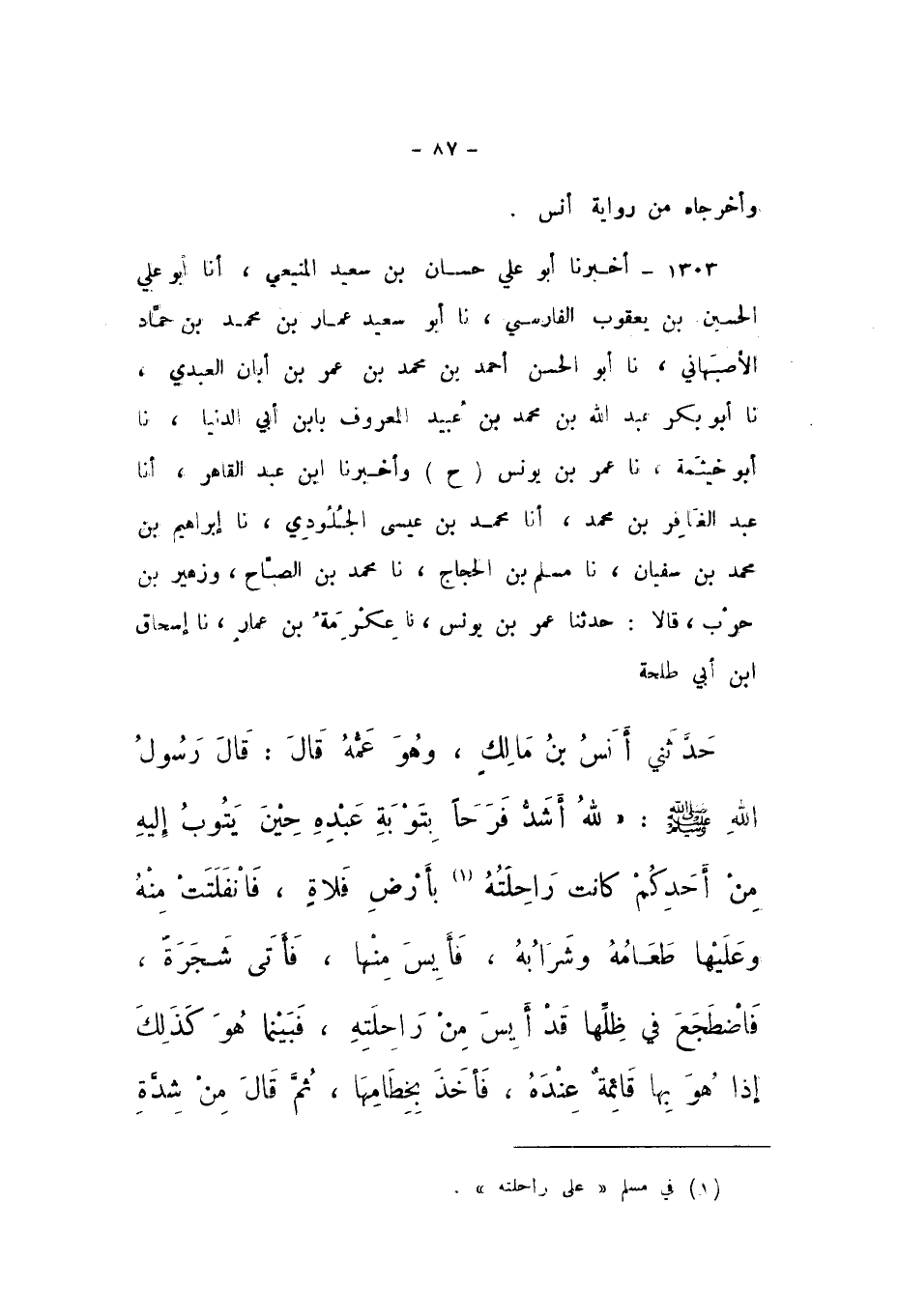 ح وَأَخْبَرَنَا ابْنُ عَبْدِ الْقَاهِرِ، أَنا عَبْدُ الْغَافِرِ بْنُ مُحَمَّدٍ، أَنا مُحَمَّدُ بْنُ عِيسَى الْجُلُودِيُّ، نَا إِبْرَاهِيمُ بْنُ مُحَمَّدِ بْنِ سُفْيَانَ، نَا مُسْلِمُ بْنُ الْحَجَّاجِ، نَا مُحَمَّدُ بْنُ الصَّبَّاحِ، وَزُهَيْرُ بْنُ حَرْبٍ، قَالا: حَدَّثَنَا عُمَرُ بْنُ يُونُسَ، نَا عِكْرِمَةُ بْنُ عَمَّارٍ، نَا إِسْحَاقُ بْنُ أَبِي طَلْحَةَ، حَدَّثَنِي أَنَسُ بْنُ مَالِكٍ، وَهُوَ عَمُّهُ، قَالَ: قَالَ رَسُولُ اللَّهِ صَلَّى اللهُ عَلَيْهِ وَسَلَّمَ: " لَلَّهُ أَشَدُّ فَرَحًا بِتَوْبَةِ عَبْدِهِ حِينَ يَتُوبُ إِلَيْهِ مِنْ أَحَدِكُمْ كَانَتْ رَاحِلَتُهُ بِأَرْضِ فَلاةٍ، فَانْفَلَتَتْ مِنْهُ، وَعَلَيْهَا طَعَامُهُ وَشَرَابُهُ، فَأَيِسَ مِنْهَا، فَأَتَى شَجَرَةً، فَاضْطَجَعَ فِي ظِلِّهَا قَدْ أَيِسَ مِنْ رَاحِلَتِهِ، فَبَيْنَمَا هُوَ كَذَلِكَ إِذَا هُوَ بِهَا قَائِمَةٌ عِنْدَهُ، فَأَخَذَ بِخِطَامِهَا، ثُمَّ قَالَ مِنْ شِدَّةِ