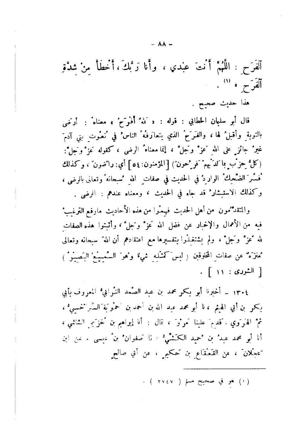 وَالْمُتَقَدِّمُونَ مِنْ أَهْلِ الْحَدِيثِ فَهِمُوا مِنْ هَذِهِ الأَحَادِيثِ مَا وَقَعَ التَّرْغِيبُ فِيهِ مِنَ الأَعْمَالِ، وَالإِخْبَارِ عَنْ فَضْلِ اللَّهِ عَزَّ وَجَلَّ، وَأَثْبَتُوا هَذِهِ الصِّفَاتِ لِلَّهِ عَزَّ وَجَلَّ، وَلَمْ يَشْتَغِلُوا بِتَفْسِيرِهَا، مَعَ اعْتِقَادِهِمْ أَنَّ اللَّهَ سُبْحَانَهُ وَتَعَالَى مُنَزَّهٌ عَنْ صِفَاتِ الْمَخْلُوقِينَ {لَيْسَ كَمِثْلِهِ شَيْءٌ وَهُوَ السَّمِيعُ الْبَصِيرُ} [الشورى: 11]