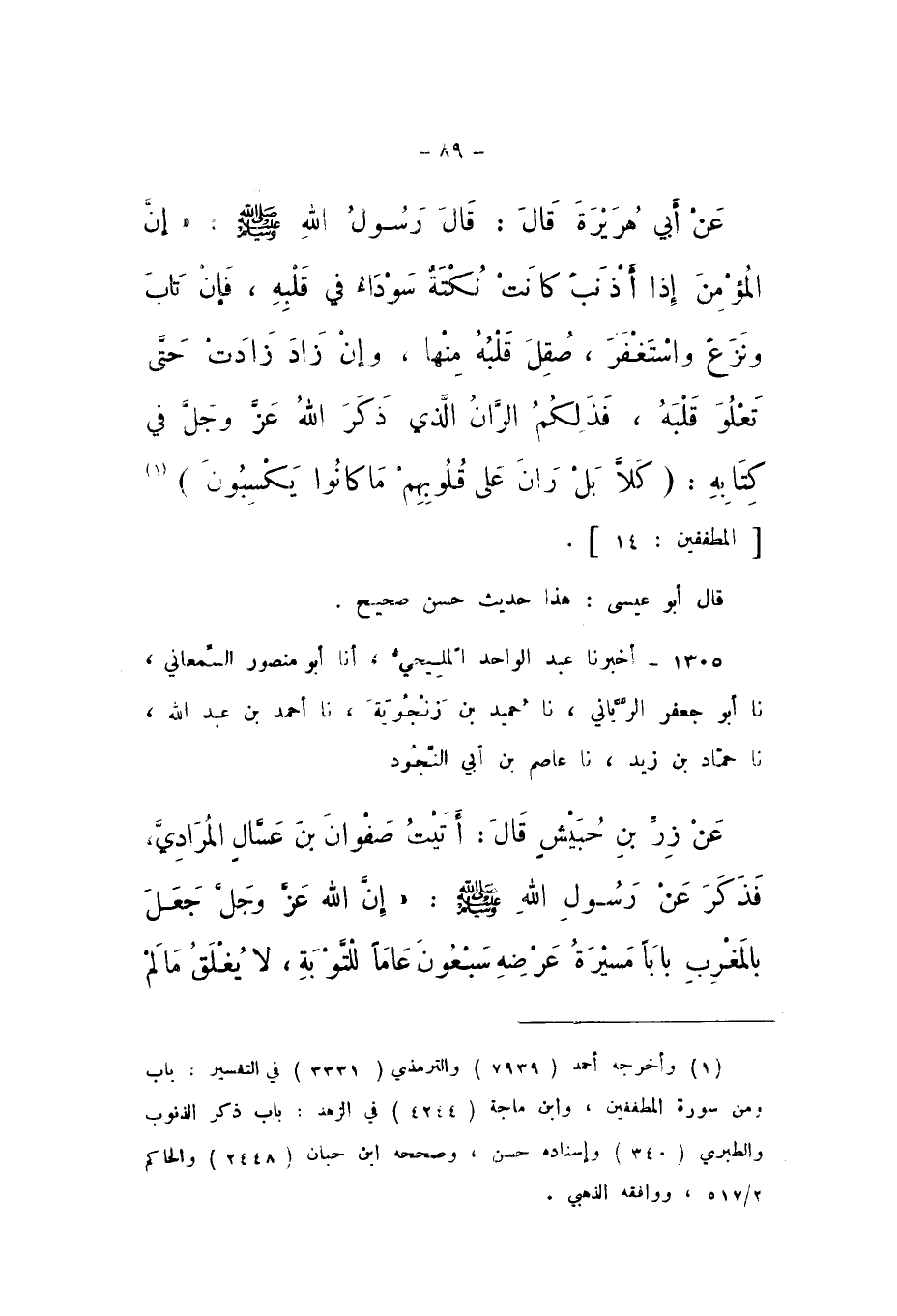 1305 - أَخْبَرَنَا عَبْدُ الْوَاحِدِ الْمَلِيحِيُّ، أَنا أَبُو مَنْصُورٍ السَّمْعَانِيُّ، نَا أَبُو جَعْفَرٍ الرَّيَّانِيُّ، نَا حُمَيْدُ بْنُ زَنْجُوَيْهِ، نَا أَحْمَدُ بْنُ عَبْدِ اللَّهِ، نَا حَمَّادُ بْنُ زَيْدٍ، نَا عَاصِمُ بْنُ أَبِي النَّجُودِ، عَنْ زِرِّ بْنِ حُبَيْشٍ، قَالَ: أَتَيْتُ صَفْوَانَ بْنَ عَسَّالٍ الْمُرَادِيَّ، فَذَكَرَ عَنْ رَسُولِ اللَّهِ صَلَّى اللهُ عَلَيْهِ وَسَلَّمَ: " إِنَّ اللَّهَ عَزَّ وَجَلَّ جَعَلَ بِالْمَغْرِبِ بَابًا مَسِيرَةُ عَرْضِهِ سَبْعُونَ عَامًا لِلتَّوْبَةِ، لَا يُغْلَقُ مَا لَمْ