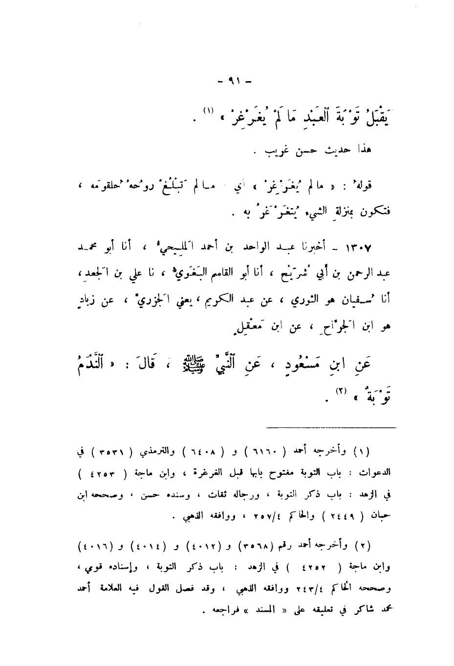 1307 - أَخْبَرَنَا عَبْدُ الْوَاحِدِ بْنُ أَحْمَدَ الْمَلِيحِيُّ، أَنا أَبُو مُحَمَّدٍ عَبْدُ الرَّحْمَنِ بْنُ أَبِي شُرَيْحٍ، أَنا أَبُو الْقَاسِمِ الْبَغَوِيُّ، نَا عَلِيُّ بْنُ الْجَعْدِ، أَنا سُفْيَانُ هُوَ الثَّوْرِيُّ، عَنْ عَبْدِ الْكَرِيمِ يَعْنِي الْجَزَرِيَّ، عَنْ زِيَادٍ هُوَ ابْنُ الْجَرَّاحِ، عَنِ ابْنِ مَعْقِلٍ، عَنِ ابْنِ مَسْعُودٍ، عَنِ النَّبِيِّ صَلَّى اللهُ عَلَيْهِ وَسَلَّمَ، قَالَ: «النَّدَمُ تَوْبَةٌ»