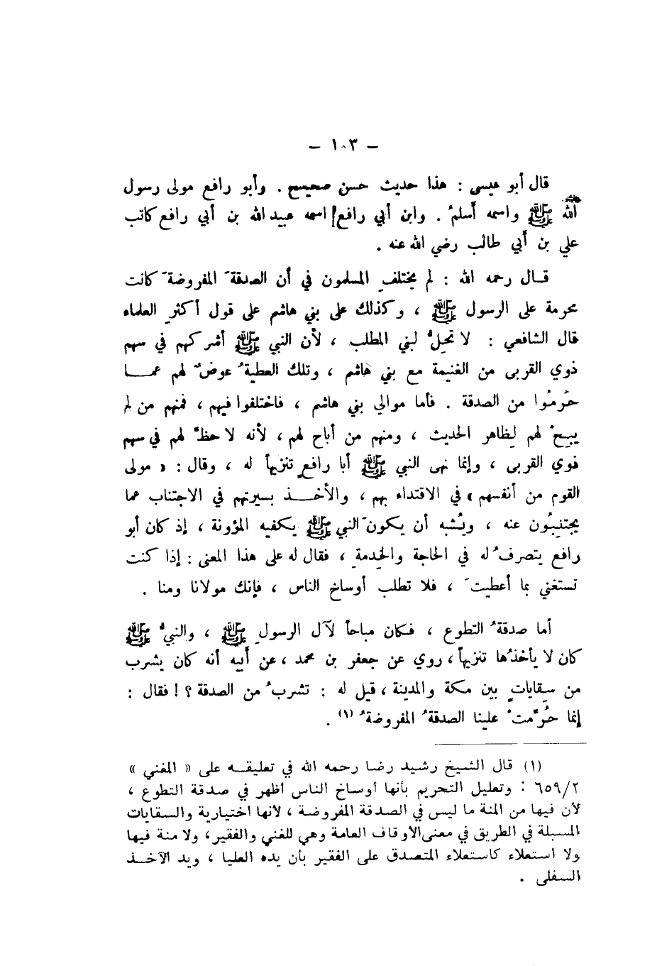 قَالَ رَحِمَهُ اللَّهُ: لَمْ يَخْتَلِفِ الْمُسْلِمُونَ فِي أَنَّ الصَّدَقَةَ الْمَفْرُوضَةَ كَانَتْ مُحَرَّمَةً عَلَى الرَّسُولِ صَلَّى اللهُ عَلَيْهِ وَسَلَّمَ، وَكَذَلِكَ عَلَى بَنِي هَاشِمٍ عَلَى قَوْلِ أَكْثَرِ الْعُلَمَاءِ، قَالَ الشَّافِعِيُّ: لَا تَحِلُّ لِبَنِي الْمُطَّلِبِ، لِأَنَّ النَّبِيَّ صَلَّى اللهُ عَلَيْهِ وَسَلَّمَ أَشْرَكَهُمْ فِي سَهْمِ ذَوِي الْقُرْبَى مِنَ الْغَنِيمَةِ مَعَ بَنِي هَاشِمٍ، وَتِلْكَ الْعَطِيَّةُ عِوَضٌ لَهُمْ عَمَّا حُرِمُوا مِنَ الصَّدَقَةِ.