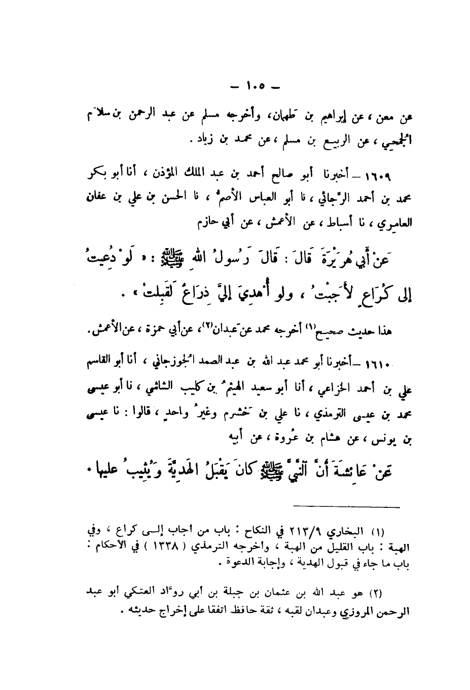 1610 - أَخْبَرَنَا أَبُو مُحَمَّدٍ عَبْدُ اللَّهِ بْنُ عَبْدِ الصَّمَدِ الْجُوزَجَانِيُّ، أَنا أَبُو الْقَاسِمِ عَلِيُّ بْنُ أَحْمَدَ الْخُزَاعِيُّ، أَنا أَبُو سَعِيدٍ الْهَيْثَمُ بْنُ كُلَيْبٍ الشَّاشِيُّ، نَا أَبُو عِيسَى مُحَمَّدُ بْنُ عِيسَى التِّرْمِذِيُّ، نَا عَلِيُّ بْنُ خَشْرَمٍ، وَغَيْرُ وَاحِدٍ، قَالُوا: نَا عِيسَى بْنُ يُونُسَ، عَنْ هِشَامِ بْنِ عُرْوَةَ، عَنْ أَبِيهِ، عَنْ عَائِشَةَ، أَنّ النَّبِيَّ صَلَّى اللهُ عَلَيْهِ وَسَلَّمَ «كَانَ يَقْبَلُ الْهَدِيَّةَ، وَيُثِيبُ عَلَيْهَا».