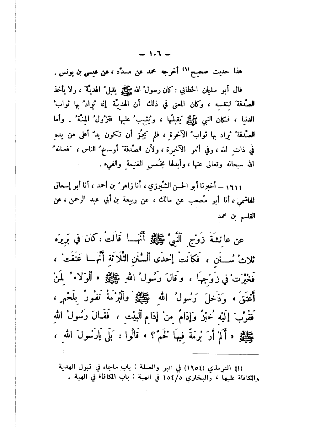 1611 - أَخْبَرَنَا أَبُو الْحَسَنِ الشِّيرَزِيُّ، أَنا زَاهِرُ بْنُ أَحْمَدَ، أَنا أَبُو إِسْحَاقَ الْهَاشِمِيُّ، أَنا أَبُو مُصْعَبٍ، عَنْ مَالِكٍ، عَنْ رَبِيعَةَ بْنِ أَبِي عَبْدِ الرَّحْمَنِ، عَنِ الْقَاسِمِ بْنِ مُحَمَّدٍ، عَنْ عَائِشَةَ، زَوْجِ النَّبِيِّ صَلَّى اللهُ عَلَيْهِ وَسَلَّمَ، أَنَّهَا قَالَتْ: كَانَ فِي بَرِيرَةَ ثَلاثُ سُنَنٍ، فَكَانَتْ إِحْدَى السُّنَنِ الثَّلاثَةِ أَنَّهَا عَتَقَتْ، فَخُيِّرَتْ فِي زَوْجِهَا، وَقَالَ رَسُولُ اللَّهِ صَلَّى اللهُ عَلَيْهِ وَسَلَّمَ: «الْوَلاءُ لِمَنْ أَعْتَقَ»، وَدَخَلَ رَسُولُ اللَّهِ صَلَّى اللهُ عَلَيْهِ وَسَلَّمَ صَلَّى اللهُ عَلَيْهِ وَسَلَّمَ وَالْبُرْمَةُ تَفُورُ بِلَحْمٍ، فَقُرِّبَ إِلَيْهِ خُبْزٌ، وَإِدَامٌ مِنْ إِدَامِ الْبَيْتِ، فَقَالَ رَسُولُ اللَّهِ صَلَّى اللهُ عَلَيْهِ وَسَلَّمَ: «أَلَمْ أَرَ بُرْمَةً فِيهَا لَحْمٌ؟» قَالُوا: بَلَى يَا رَسُولَ اللَّهِ،