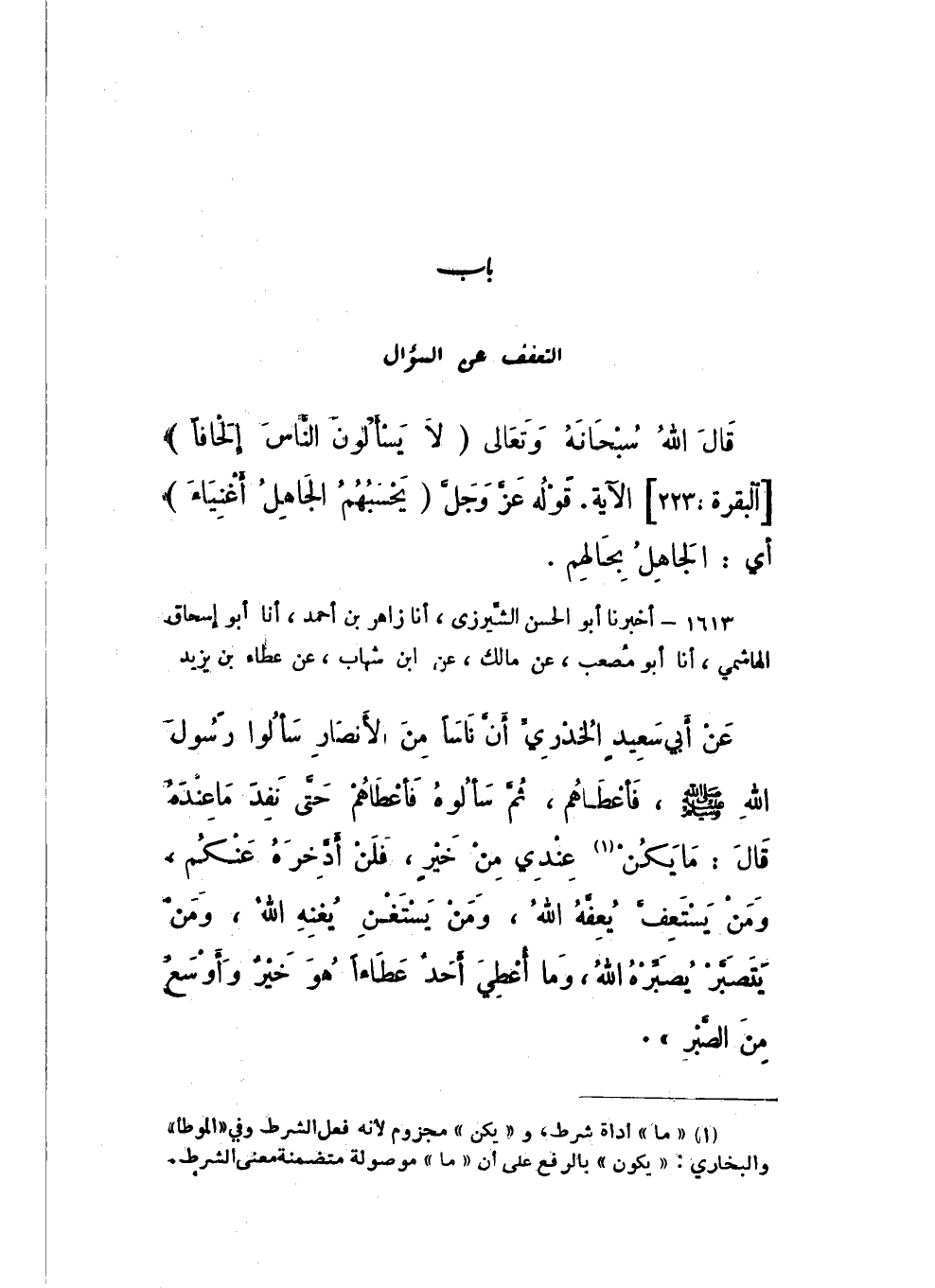 1613 - أَخْبَرَنَا أَبُو الْحَسَنِ الشِّيرَزِيُّ، أَنا زَاهِرُ بْنُ أَحْمَدَ، أَنا أَبُو إِسْحَاقَ الْهَاشِمِيُّ، أَنا أَبُو مُصْعَبٍ، عَنْ مَالِكٍ، عَنِ ابْنِ شِهَابٍ، عَنْ عَطَاءِ بْنِ يَزِيدَ، عَنْ أَبِي سَعِيدٍ الْخُدْرِيِّ، أَنَّ نَاسًا مِنَ الْأَنْصَارِ سَأَلُوا رَسُولَ اللَّهِ صَلَّى اللهُ عَلَيْهِ وَسَلَّمَ، فَأَعْطَاهُمْ، ثُمَّ سَأَلُوهُ فَأَعْطَاهُمْ، حَتَّى نَفِدَ مَا عِنْدَهُ، قَالَ: «مَا يَكُنْ عِنْدِي مِنْ خَيْرٍ، فَلَنْ أَدَّخِرَهُ عَنْكُمْ، وَمَنْ يَسْتَعِفَّ يُعِفَّهُ اللَّهُ، وَمَنْ يَسْتَغْنِ يُغْنِهِ اللَّهُ، وَمَنْ يَتَصَبَّرْ يُصَبِّرْهُ اللَّهُ، وَمَا أُعْطِيَ أحَدٌ عَطاءً، هُوَ خَيْرٌ وَأَوْسَعُ مِنَ الصَّبْرِ».