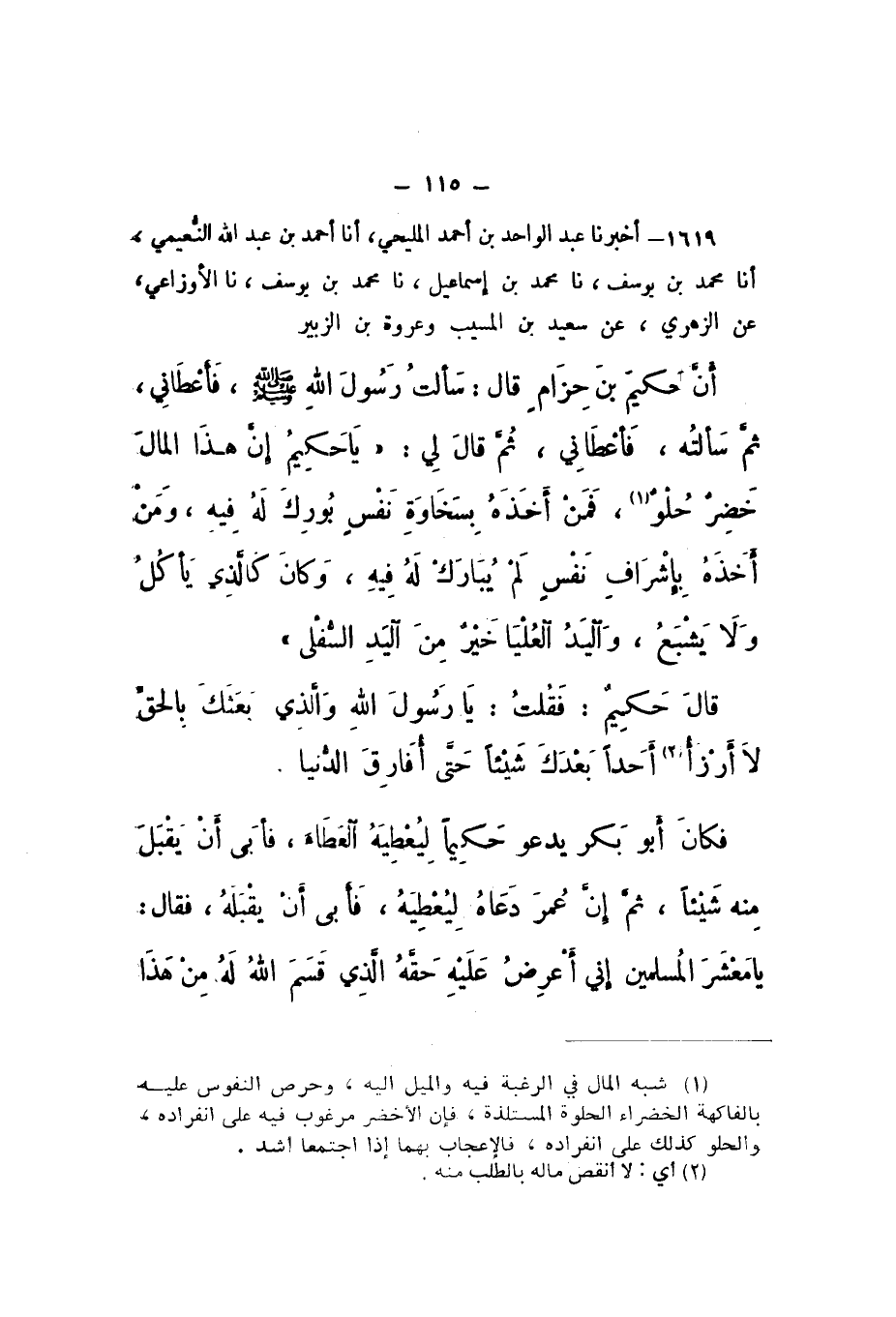 1619 - أَخْبَرَنَا عَبْدُ الْوَاحِدِ بْنُ أَحْمَدَ الْمَلِيحِيُّ، أَنا أَحْمَدُ بْنُ عَبْدِ اللَّهِ النُّعَيْمِيُّ، أَنا مُحَمَّدُ بْنُ يُوسُفَ، نَا مُحَمَّدُ بْنُ إِسْمَاعِيلَ، نَا مُحَمَّدُ بْنُ يُوسُفَ، نَا الْأَوْزَاعِيُّ، عَنِ الزُّهْرِيِّ، عَنْ سَعِيدِ بْنِ الْمُسَيِّبِ، وَعُرْوَةَ بْنِ الزُّبَيْرِ، أنَّ حَكِيمَ بْنَ حِزَامٍ، قَالَ: سَأَلْتُ رَسُولَ اللَّهِ صَلَّى اللهُ عَلَيْهِ وَسَلَّمَ، فَأَعْطَانِي، ثُمَّ سَأَلْتُهُ، فَأَعْطَانِي، ثُمَّ قَالَ لِي: «يَا حَكِيمُ، إِنَّ هَذَا الْمَالَ خَضِرٌ حُلْوٌ، فَمَنْ أَخَذَهُ بِسَخَاوَةِ نَفْسٍ بُورِكَ لَهُ فِيهِ، وَمَنْ أَخَذَهُ بِإِشْرَافِ نَفْسٍ لَمْ يُبَارَكْ لَهُ فِيهِ، وَكَانَ كَالَّذِي يَأْكُلُ وَلا يَشْبَعُ، وَالْيَدُ الْعُلْيَا خَيْرٌ مِنَ الْيَدِ السُّفْلَى».