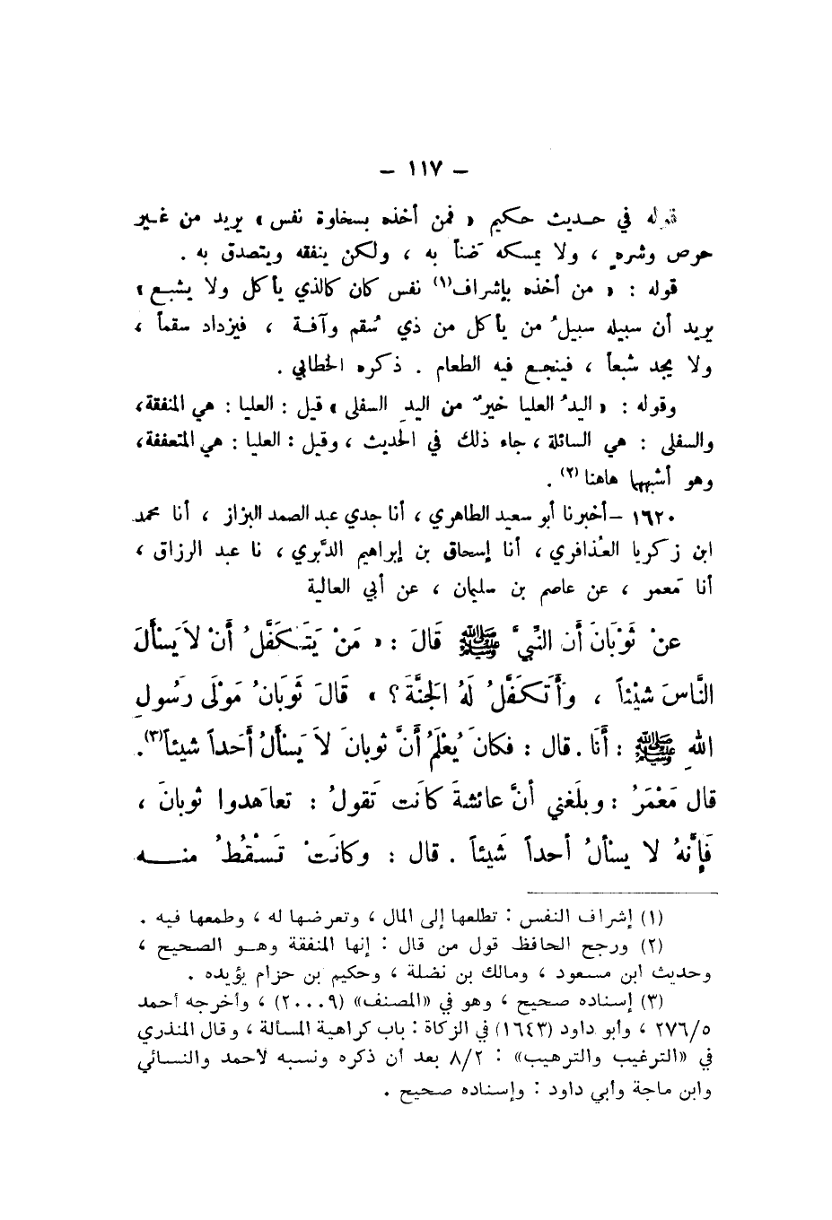 1620 - أَخْبَرَنَا أَبُو سَعِيدٍ الطَّاهِرِيُّ، أَنا جَدِّي عَبْدُ الصَّمَدِ الْبَزَّارُ، أَنا مُحَمَّدُ بْنُ زَكَرِيَّا الْعُذَافِرِيُّ، أَنا إِسْحَاقُ بْنُ إِبْرَاهِيمَ الدَّبَرِيُّ، نَا عَبْدُ الرَّزَّاقِ، أَنا مَعْمَرٌ، عَنْ عَاصِمِ بْنِ سُلَيْمَانَ، عَنْ أَبِي الْعَالِيَةِ، عَنْ ثَوْبَانَ، أَنّ النَّبِيَّ صَلَّى اللهُ عَلَيْهِ وَسَلَّمَ قَالَ: «مَنْ يَتَكَفَّلُ أَنْ لَا يَسْأَلَ النَّاسَ شَيْئًا، وَأَتَكَفَّلُ لَهُ الْجَنَّةَ؟» قَالَ ثَوْبَانُ، مَوْلَى رَسُولِ اللَّهِ صَلَّى اللهُ عَلَيْهِ وَسَلَّمَ: أَنَا.