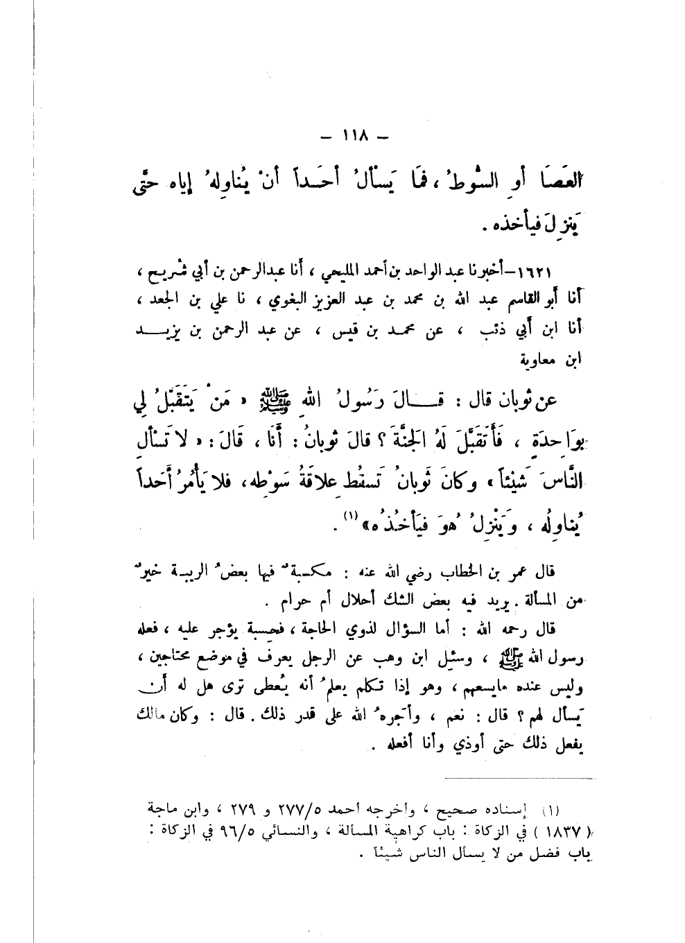 1621 - أَخْبَرَنَا عَبْدُ الْوَاحِدِ بْنُ أَحْمَدَ الْمَلِيحِيُّ، أَنا عَبْدُ الرَّحْمَنِ بْنُ أَبِي شُرَيْحٍ، أَنا أَبُو الْقَاسِمِ عَبْدُ اللَّهِ بْنُ مُحَمَّدِ بْنِ عَبْدِ الْعَزِيزِ الْبَغَوِيُّ، نَا عَلِيُّ بْنُ الْجَعْدِ، أَنا ابْنُ أَبِي ذِئْبٍ، عَنْ مُحَمَّدِ بْنِ قَيْسٍ، عَنْ عَبْدِ الرَّحْمَنِ بْنِ يَزِيدَ بْنِ مُعَاوِيَةَ، عَنْ ثَوْبَانَ، قَالَ: قَالَ رَسُولُ اللَّهِ صَلَّى اللهُ عَلَيْهِ وَسَلَّمَ: «مَنْ يَتَقَبَّلُ لِي بِوَاحِدَةٍ، فَأَتَقَبَّلُ لَهُ الجنَّةَ؟» قَالَ ثَوْبَانُ: أَنَا، قَالَ: «لَا تَسْأَلِ النَّاسَ شَيْئًا».