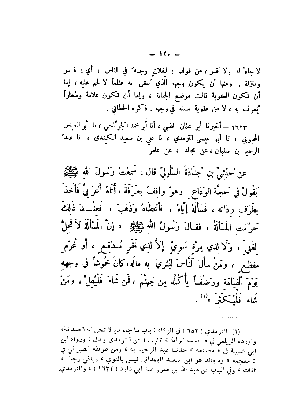 1623 - أَخْبَرَنَا أَبُو عُثْمَانَ الضَّبِّيُّ، أَنا أَبُو مُحَمَّدٍ الْجَرَّاحِيُّ، نَا أَبُو الْعَبَّاسِ الْمَحْبُوبِيُّ، نَا أَبُو عِيسَى التِّرْمِذِيُّ، نَا عَلِيُّ بْنُ سَعِيدٍ الْكِنْدِيُّ، نَا عَبْدُ الرَّحِيمِ بْنُ سُلَيْمَانَ، عَنْ مُجَالِدٍ، عَنْ عَامِرٍ، عَنْ حُبْشِيِّ بْنِ جُنَادَةَ السَّلُولِيِّ، قَالَ: سَمِعْتُ رَسُولَ اللَّهِ صَلَّى اللهُ عَلَيْهِ وَسَلَّمَ يَقُولُ فِي حَجَّةِ الْوَدَاعِ وَهُوَ وَاقِفٌ بِعَرَفَةَ، أَتَاهُ أَعْرَابِيٌّ، فَأَخَذَ بِطَرَفِ رِدَائِهِ، فَسَأَلَهُ إِيَّاهُ، فَأَعْطَاهُ وَذَهَبَ، فَعِنْدَ ذَلِكَ حَرُمَتِ الْمَسْأَلَةُ، فَقَالَ رَسُولُ اللَّهِ صَلَّى اللهُ عَلَيْهِ وَسَلَّمَ: «إِنَّ الْمَسْأَلَةَ لَا تَحِلُّ لِغَنِيٍّ، وَلا لِذِي مِرَّةٍ سَوِيٍّ إِلا لِذِي فَقْرٍ مُدْقِعٍ، أَوْ غُرْمٍ مُفْظِعٍ، وَمَنْ سَأَلَ النَّاسَ لِيُثْرِيَ بِهِ مَالَهُ، كَانَ خُمُوشًا فِي وَجْهِهِ يَوْمَ الْقِيَامَةِ، وَرَضْفًا يَأْكُلهُ مِنْ جَهَنَّمَ، فَمَنْ شَاءَ فَلْيُقِلَّ، وَمَنْ شَاءَ فَلْيُكْثِرْ».