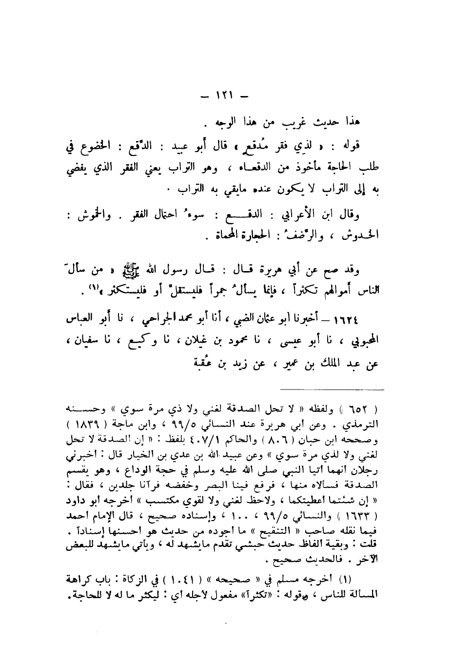 1624 - أَخْبَرَنَا أَبُو عُثْمَانَ الضَّبِّيُّ، أَنا أَبُو مُحَمَّدٍ الْجَرَّاحِيُّ، نَا أَبُو الْعَبَّاسِ الْمَحْبُوبِيُّ، نَا أَبُو عِيسَى، نَا مَحْمُودُ بْنُ غَيْلانَ، نَا وَكِيعٌ، نَا سُفْيَانُ، عَنْ عَبْدِ الْمَلِكِ بْنِ عُمَيْرٍ، عَنْ زَيْدِ بْنِ عُقْبَةَ،
