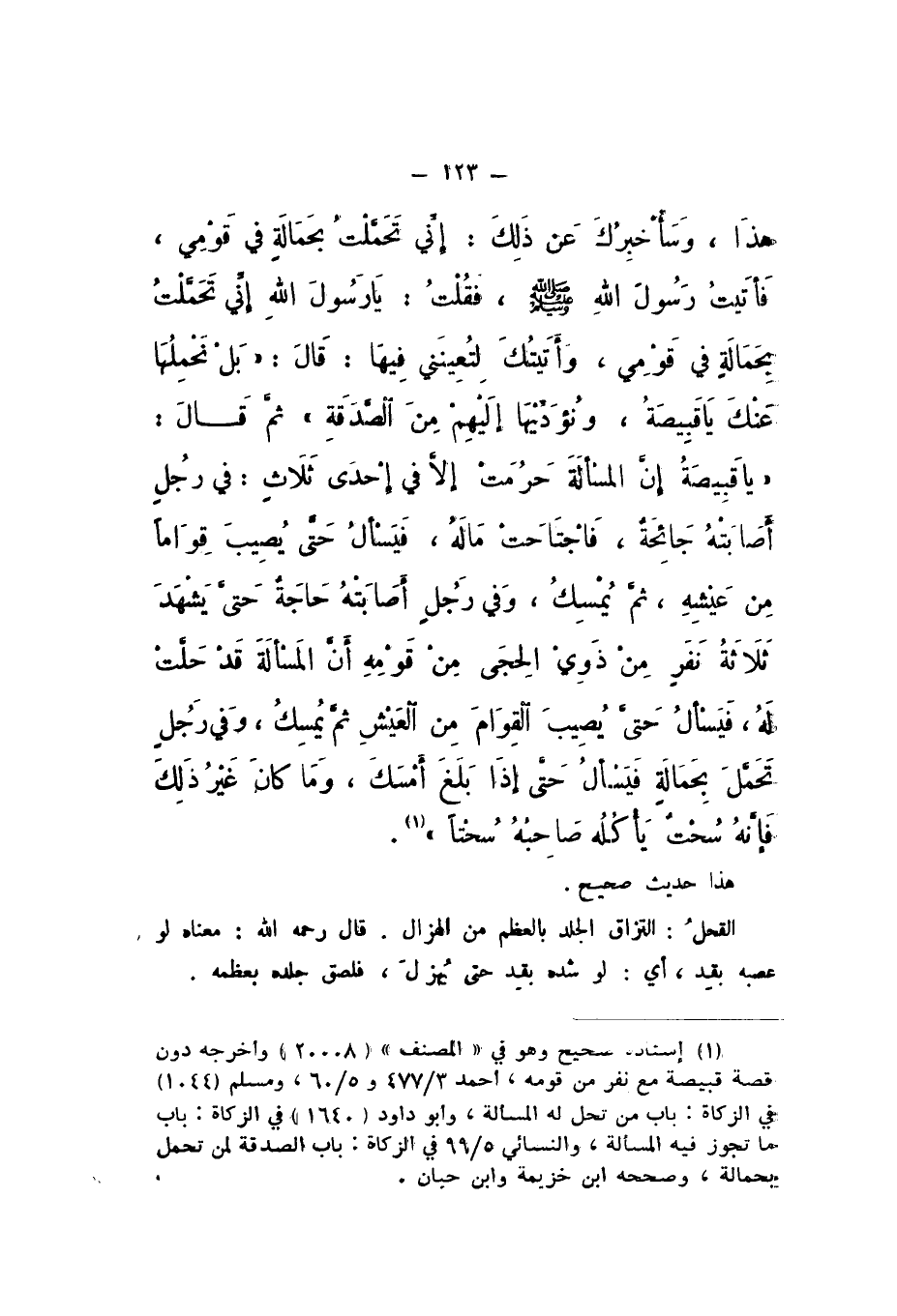 هَذَا، وَسَأُخْبِرُكَ عَنْ ذَلِكَ، إِنِّي تَحَمَّلْتُ بِحَمَالَةٍ فِي قَوْمِي، فَأَتَيْتُ رَسُولَ اللَّهِ صَلَّى اللهُ عَلَيْهِ وَسَلَّمَ، فَقُلْتُ: يَا رَسُولَ اللَّهِ، إِنِّي تَحَمَّلْتُ بِحَمَالَةٍ فِي قَوْمِي، أَتَيْتُكَ لِتُعِينَنِي فِيهَا، قَالَ: «بَلْ نَحْمِلُهَا عَنْكَ يَا قَبِيصَةُ، وَنُؤَدِّيهَا إِلَيْهِمْ مِنَ الصَّدَقَةِ»، ثُمَّ قَالَ: " يَا قَبِيصَةُ، إِنَّ الْمَسْأَلَةَ حَرُمَتْ إِلا فِي إِحْدَى ثَلاثٍ: فِي رَجُلٍ أَصَابَتْهُ جَائِحَةٌ، فَاجْتَاحَتْ مَالَهُ، فَيَسْأَلُ حَتَّى يُصِيبَ قِوَامًا مِنْ عَيْشِهِ، ثُمَّ يُمْسِكُ، وَفِي رَجُلٍ أَصَابَتْهُ حَاجَةٌ حَتَّى يَشْهَدَ ثَلاثَةُ نَفَرٍ مِنْ ذَوِي الْحِجَى مِنْ قَوْمِهِ أَنَّ الْمَسْأَلَةَ قَدْ حَلَّتْ لَهُ، فَيَسْأَلُ حَتَّى يُصِيبَ الْقِوَامَ مِنَ الْعَيْشِ ثُمَّ يُمْسِكُ، وَفِي رَجُلٍ تَحَمَّلَ بِحَمَالَةٍ، فَيَسْأَلُ حَتَّى إِذَا بَلَغَ أَمْسَكَ، وَمَا كَانَ غَيْرُ ذَلِكَ، فَإِنَّهُ سُحْتٌ يَأْكُلُهُ صَاحِبُهُ سُحْتًا ".