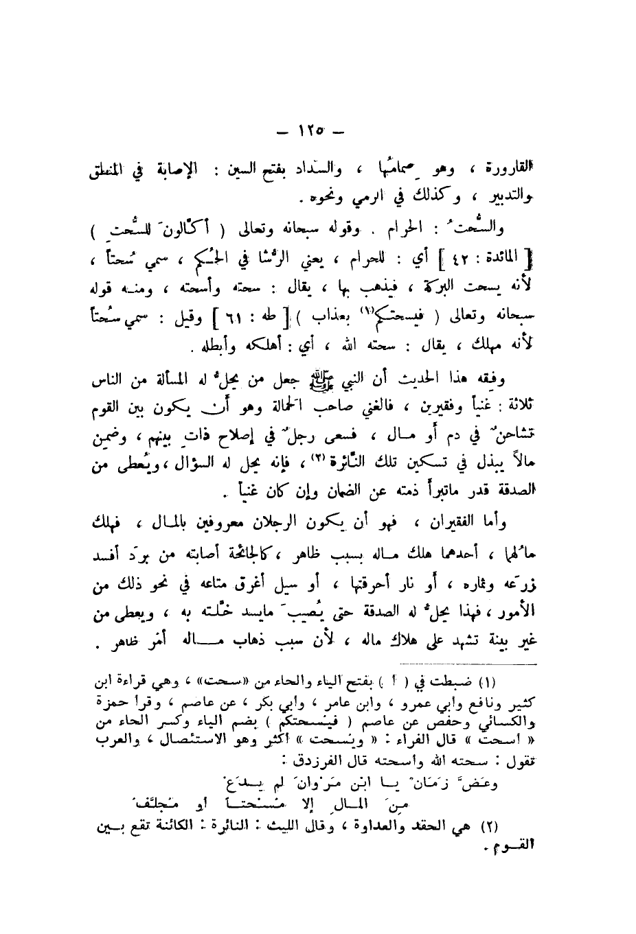 وَقَوْلُهُ سُبْحَانَهُ وَتَعَالَى: {أَكَّالُونَ لِلسُّحْتِ} [الْمَائِدَة: 42]، أَيْ: لِلْحَرَامِ، يَعْنِي الرِّشَا فِي الْحُكْمِ، سُمِّيَ سُحْتًا، لِأَنَّهُ يُسْحِتُ الْبَرَكَةَ، فَيَذْهَبُ بِهَا، يُقَالُ: سَحَتَهُ وَأَسْحَتَهُ، وَمِنْهُ قَوْلُهُ سُبْحَانَهُ وَتَعَالَى {فَيُسْحِتَكُمْ بِعَذَابٍ} [طه: 61]، وَقِيلَ: سُمِّيَ سُحْتًا لِأَنَّهُ مُهْلِكٌ، يُقَالُ: سَحَتَهُ اللَّهُ، أَيْ: أَهْلَكَهُ وَأَبْطَلَهُ.