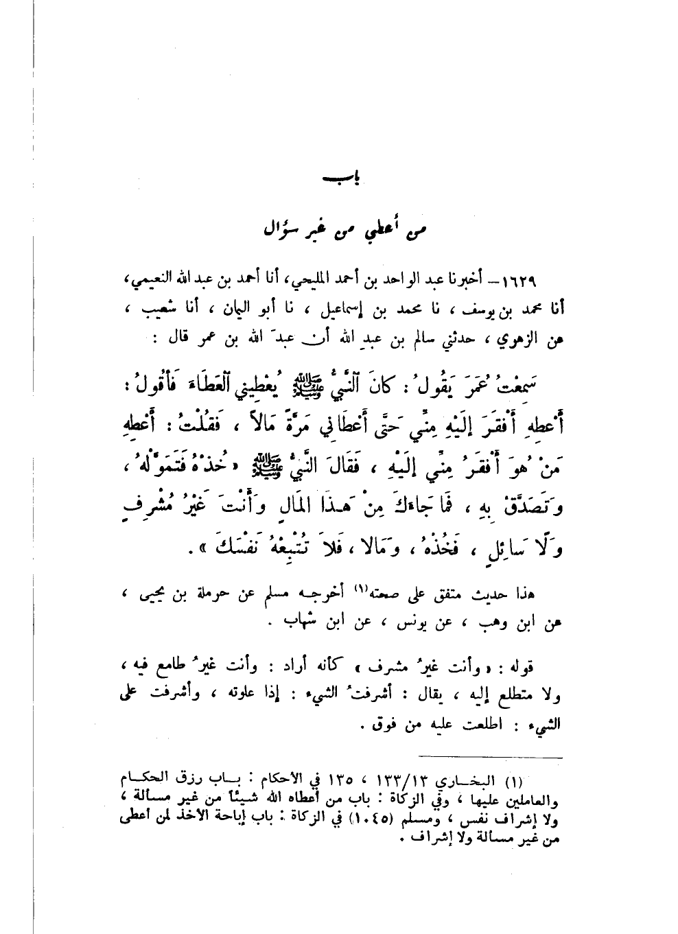 1629 - أَخْبَرَنَا عَبْدُ الْوَاحِدِ بْنُ أَحْمَدَ الْمَلِيحِيُّ، أَنا أَحْمَدُ بْنُ عَبْدِ اللَّهِ النُّعَيْمِيُّ، أَنا مُحَمَّدُ بْنُ يُوسُفَ، نَا مُحَمَّدُ بْنُ إِسْمَاعِيلَ، نَا أَبُو الْيَمَانِ، أَنا شُعَيْبٌ، عَنِ الزُّهْرِيِّ، حَدَّثَنِي سَالِمُ بْنُ عَبْدِ اللَّهِ، أَنَّ عَبْدَ اللَّهِ بْنَ عُمَرَ، قَالَ: سَمِعْتُ عُمَرَ، يَقُولُ: كَانَ النَّبِيُّ صَلَّى اللهُ عَلَيْهِ وَسَلَّمَ يُعْطِينِي الْعَطَاءَ، فَأقُولُ: أَعْطِهِ أَفْقَرَ إِلَيْهِ مِنِّي، حَتَّى أَعْطَانِي مَرَّةً مَالا، فَقُلْتُ: أَعْطِهِ مَنْ هُوَ أَفْقَرُ مِنِّي إِلَيْهِ، فَقَالَ: النَّبِيُّ صَلَّى اللهُ عَلَيْهِ وَسَلَّمَ: «خُذْهُ فَتَمَوَّلْهُ، وَتَصَدَّقْ بِهِ، فَمَا جَاءَكَ مِنْ هَذَا الْمَالِ وَأَنْتَ غَيْرُ مُشْرِفٍ وَلا سَائِلٍ، فَخُذْهُ، وَمَا لَا، فَلا تُتْبِعْهُ نَفْسَكَ».