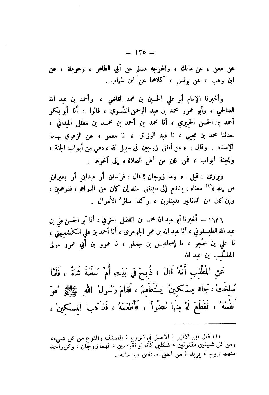 ويروى: قِيلَ: وَمَا زَوْجَانِ؟ قَالَ: «فَرَسَانِ، أَوْ عَبْدَانِ، أَوْ بَعِيرَانِ مِنْ إِبِلِهِ»