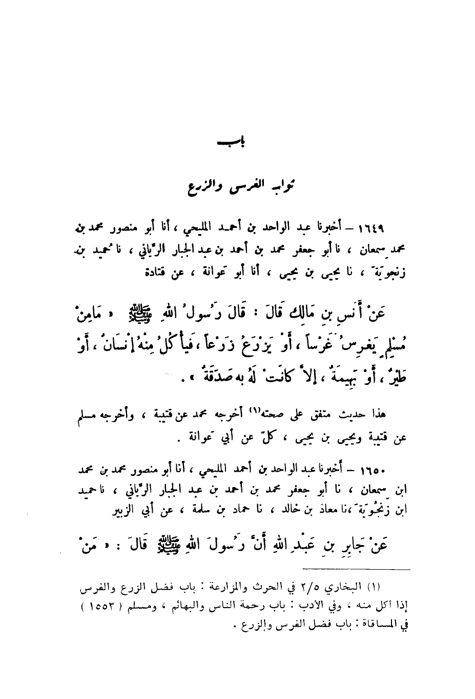 1649 - أَخْبَرَنَا عَبْدُ الْوَاحِدِ بْنُ أَحْمَدَ الْمَلِيحِيُّ، أَنا أَبُو مَنْصُورٍ مُحَمَّدُ بْنُ مُحَمَّدِ بْنِ سَمْعَانَ، نَا أَبُو جَعْفَرٍ مُحَمَّدُ بْنُ أَحْمَدَ بْنِ عَبْدِ الْجَبَّارِ الرَّيَّانِيُّ، نَا حُمَيْدُ بْنُ زَنْجُوَيْهِ، نَا يَحْيَى بْنُ يَحْيَى، أَنا أَبُو عَوَانَةَ، عَنْ قَتَادَةَ، عَنْ أَنَسِ بْنِ مَالِكٍ، قَالَ: قَالَ رَسُولُ اللَّهِ صَلَّى اللهُ عَلَيْهِ وَسَلَّمَ: «مَا مِنْ مُسْلِمٍ يَغْرِسُ غَرْسًا، أَوْ يَزْرَعُ زَرْعًا، فَيَأْكُلُ مِنْهُ إِنْسَانٌ، أَوْ طَيْرٌ، أَوْ بَهِيمَةٌ، إِلا كَانَتْ لَهُ بِهِ صَدَقَةٌ».