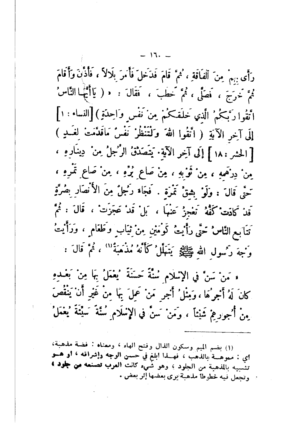 فَجَاءَ رَجُلٌ مِنَ الْأَنْصَارِ بِصُرَّةٍ قَدْ كَادَتْ كَفُّهُ تَعْجِزُ عَنْهَا، بَلْ قَدْ عَجَزَتْ، قَالَ: ثُمَّ تَتَابَعَ النَّاسُ حَتَّى رَأيْتُ كَوْمَيْنِ مِنْ ثِيَابٍ وَطَعَامٍ، وَرَأَيْتُ وَجْهَ رَسُولِ اللَّهِ صَلَّى اللهُ عَلَيْهِ وَسَلَّمَ يَتَهَلَّلُ كَأَنَّهُ مُذْهَبَةٌ، ثُمَّ قَالَ: «مَنْ سَنَّ فِي الإِسْلامِ سُنَّةً حَسَنَةً، يُعْمَلُ بِهَا مِنْ بَعْدِهِ كانَ لَهُ أَجْرُهَا، وَمِثْلُ أَجْرِ مَنْ عَمِلَ بِهَا مِنْ غَيْرِ أَنْ يَنْقُصَ مِنْ أُجُورِهِمْ شَيْئًا، وَمَنْ سَنَّ فِي الإِسْلامِ سُنَّةً سَيِّئَةً يُعْمَلُ