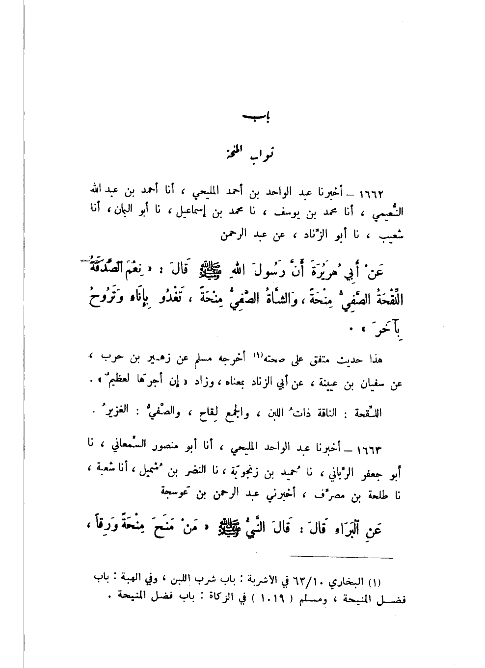 1662 - أَخْبَرَنَا عَبْدُ الْوَاحِدِ بْنُ أَحْمَدَ الْمَلِيحِيُّ، أَنا أَحْمَدُ بْنُ عَبْدِ اللَّهِ النُّعَيْمِيُّ، أَنا مُحَمَّدُ بْنُ يُوسُفَ، نَا مُحَمَّدُ بْنُ إِسْمَاعِيلَ، نَا أَبُو الْيَمَانِ، أَنا شُعَيْبٌ، نَا أَبُو الزِّنَادِ، عَنْ عَبْدِ الرَّحْمَنِ، عَنْ أَبِي هُرَيْرَةَ، أَنّ رَسُولَ اللَّهِ صَلَّى اللهُ عَلَيْهِ وَسَلَّمَ، قَالَ: «نِعْمَ الصَّدَقَةُ اللَّقْحَةُ الصَّفِيُّ مِنْحَةً، وَالشَّاةُ الصَّفِيُّ مِنْحَةً، تَغْدُو بِإِنَاءٍ وَتَرُوحُ بِآخَرَ».