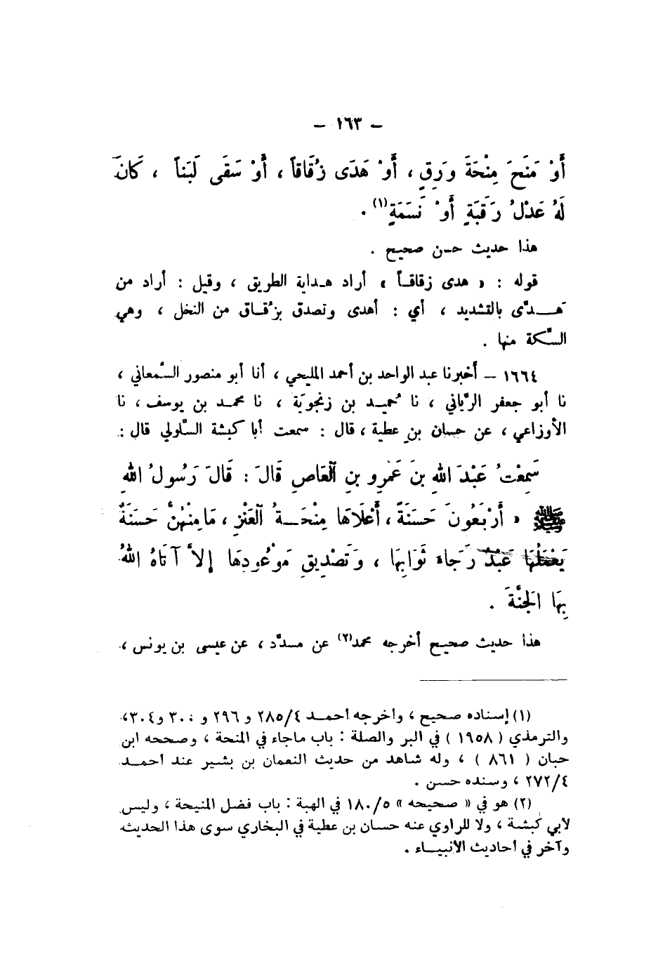1664 - أَخْبَرَنَا عَبْدُ الْوَاحِدِ بْنُ أَحْمَدَ الْمَلِيحِيُّ، أَنا أَبُو مَنْصُورٍ السَّمْعَانِيُّ، نَا أَبُو جَعْفَرٍ الرَّيَّانِيُّ، نَا حُمَيْدُ بْنُ زَنْجُوَيْهِ، نَا مُحَمَّدُ بْنُ يُوسُفَ، نَا الْأَوْزَاعِيُّ، عَنْ حَسَّانَ بْنِ عَطِيَّةَ، قَالَ: سَمِعْتُ أَبَا كَبْشَةَ السَّلُولِيَّ، قَالَ: سَمِعْتُ عَبْدَ اللَّهِ بْنَ عَمْرِو بْنِ الْعَاصِ، قَالَ: قَالَ رَسُولُ اللَّهِ صَلَّى اللهُ عَلَيْهِ وَسَلَّمَ: «أَرْبَعُونَ حَسَنَةً، أَعْلاهَا مِنْحَةُ الْعَنْزِ، مَا مِنْهُنَّ حَسَنَةٌ يَعْمَلُهَا عَبْدٌ رَجَاءَ ثَوَابِهَا، وَتَصْدِيقَ مَوْعُودِهَا إِلا آتَاهُ اللَّهُ بِهَا الْجَنَّةَ».