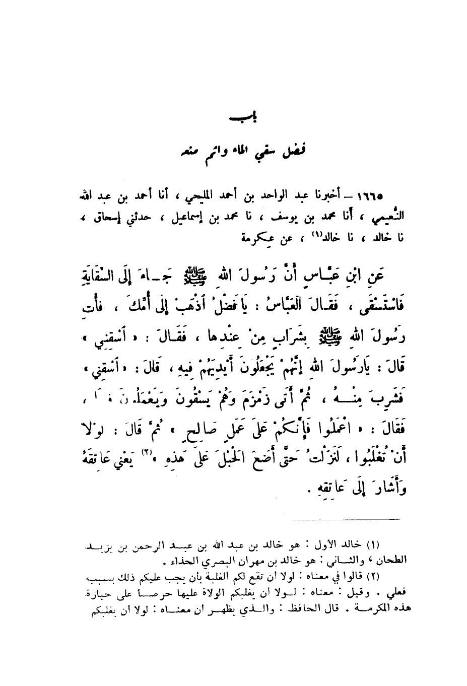 1665 - أَخْبَرَنَا عَبْدُ الْوَاحِدِ بْنُ أَحْمَدَ الْمَلِيحِيُّ، أَنا أَحْمَدُ بْنُ عَبْدِ اللَّهِ النُّعَيْمِيُّ، أَنا مُحَمَّدُ بْنُ يُوسُفَ، نَا مُحَمَّدُ بْنُ إِسْمَاعِيلَ، حَدَّثَنِي إِسْحَاقُ، نَا خَالِدٌ، نَا خَالِدٌ، عَنْ عِكْرِمَةَ، عَنِ ابْنِ عَبَّاسٍ، أَنّ رَسُولَ اللَّهِ صَلَّى اللهُ عَلَيْهِ وَسَلَّمَ جَاءَ إِلَى السِّقَايَةِ فَاسْتَسْقَى، فَقَالَ الْعَبَّاسُ: يَا فَضْلُ، اذْهَبْ إِلَى أُمِّكَ، فَأْتِ رَسُولَ اللَّهِ صَلَّى اللهُ عَلَيْهِ وَسَلَّمَ بِشَرَابٍ مِنْ عِنْدِهَا، فَقَالَ: «اسْقِنِي»، قَالَ: يَا رَسُولَ اللَّهِ، إنَّهُمْ يَجْعَلُونَ أَيْدِيَهُمْ فِيهِ، قَالَ: «اسْقِنِي»، فَشَرِبَ مِنْهُ، ثُمَّ أَتَى زَمْزَمَ وَهُمْ يَسْقُونَ وَيَعْمَلُونَ فِيهَا، فَقَالَ: «اعْمَلُوا، فَإِنَّكُمْ علَى عَمَلٍ صَالِحٍ»، ثُمَّ قَالَ: «لَوْلا أَنْ تُغْلَبُوا، لَنَزَلْتُ حَتَّى أَضَعَ الْحَبْلَ عَلَى هَذِهِ»، يَعْني: عَاتِقَهُ وَأَشَارَ إِلَى عَاتِقِهِ.