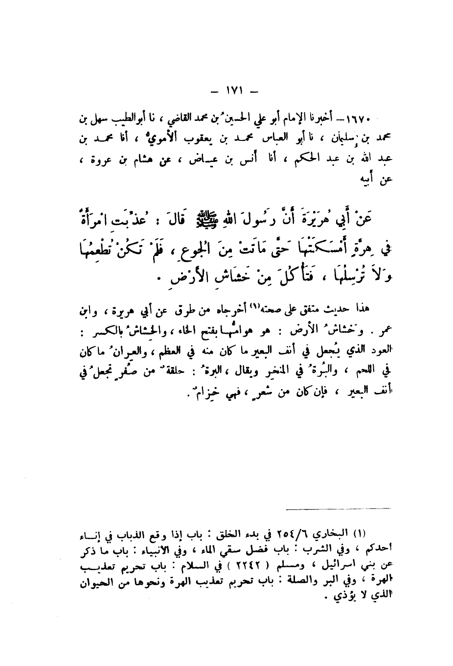 1670 - أَخْبَرَنَا الإِمَامُ أَبُو عَلِيٍّ الْحُسَيْنُ بْنُ مُحَمَّدٍ الْقَاضِي، نَا أَبُو الطَّيِّبِ سَهْلُ بْنُ مُحَمَّدِ بْنِ سُلَيْمَانَ، نَا أَبُو الْعَبَّاسِ مُحَمَّدُ بْنُ يَعْقُوبَ الْأُمَوِيُّ، أَنا مُحَمَّدُ بْنُ عَبْدِ اللَّهِ بْنِ عَبْدِ الْحَكَمِ، أَنا أَنَسُ بْنُ عِيَاضٍ، عَنْ هِشَامِ بْنِ عُرْوَةَ، عَنْ أَبِيهِ، عَنْ أَبِي هُرَيْرَةَ، أَنّ رَسُولَ اللَّهِ صَلَّى اللهُ عَلَيْهِ وَسَلَّمَ، قَالَ: «عُذِّبَتِ امْرَأَةٌ فِي هِرَّةٍ أمْسَكَتْهَا حَتَّى مَاتَتْ مِنَ الْجُوعِ، فَلَمْ تَكُنْ تُطْعِمُهَا، وَلا تُرْسِلُهَا فَتَأْكُلَ مِنْ خَشَاشِ الْأَرْضِ».