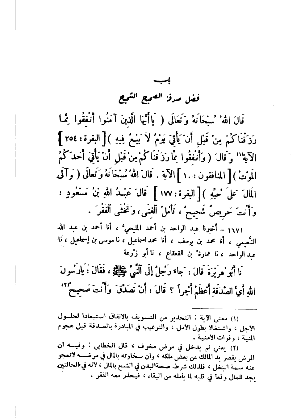 قَالَ اللَّهُ سُبْحَانَهُ وَتَعَالَى: {وَآتَى الْمَالَ عَلَى حُبِّهِ} [الْبَقَرَة: 177]، قَالَ عَبْدُ اللَّهِ بْنُ مَسْعُودٍ: وَأَنْتَ حَرِيصٌ شَحِيحٌ، تَأْمُلُ الْغِنَى، وَتَخْشَى الْفَقْرَ.