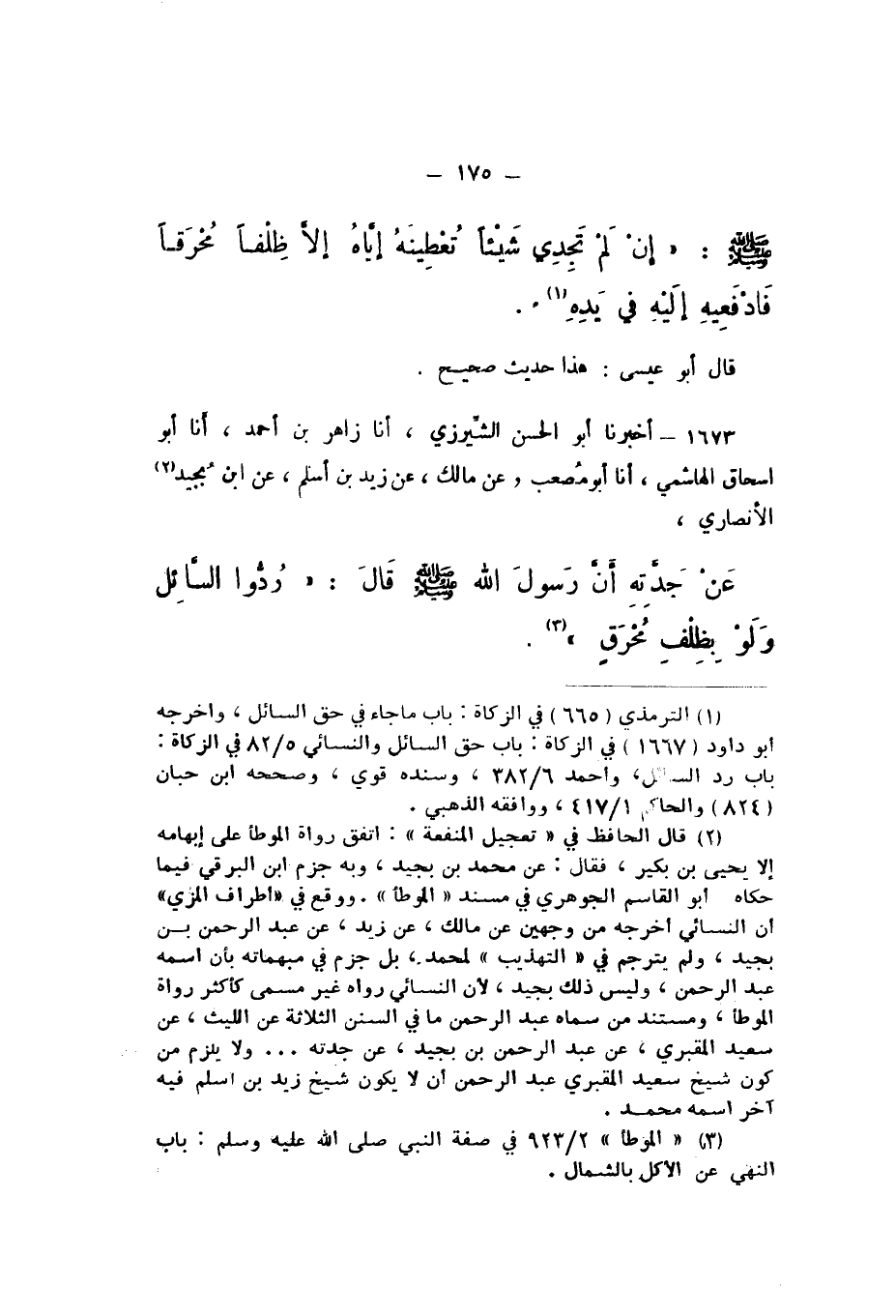 1673 - أَخْبَرَنَا أَبُو الْحَسَنِ الشِّيرَزِيُّ، أَنا زَاهِرُ بْنُ أَحْمَدَ، أَنا أَبُو إِسْحَاقَ الْهَاشِمِيُّ، أَنا أَبُو مُصْعَبٍ، عَنْ مَالِكٍ، عَنْ زَيْدِ بْنِ أَسْلَمَ، عَنِ ابْنِ بُجَيْدٍ الْأَنْصَارِيِّ، عَنْ جَدَّتِهِ، أَنّ رَسُولَ اللَّهِ صَلَّى اللهُ عَلَيْهِ وَسَلَّمَ، قَالَ: «رُدُّوا السَّائِلَ وَلَوْ بِظِلْفٍ مُحْرَقٍ»