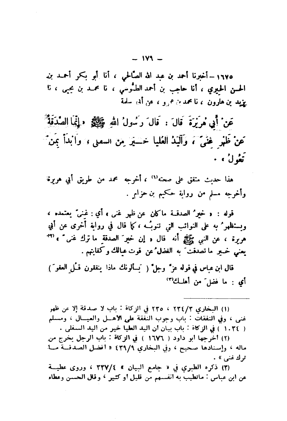 1675 - أَخْبَرَنَا أَحْمَدُ بْنُ عَبْدِ اللَّهِ الصَّالِحِيُّ، أَنا أَبُو بَكْرٍ أَحْمَدُ بْنُ الْحَسَنِ الْحِيرِيُّ، أَنا حَاجِبُ بْنُ أَحْمَدَ الطُّوسِيُّ، نَا مُحَمَّدُ بْنُ يَحْيَى، نَا يَزِيدُ بْنُ هَارُونَ، نَا مُحَمَّدُ بْنُ عَمْرٍو، عَنْ أَبِي سَلَمَةَ، عَنْ أَبِي هُرَيْرَةَ، قَالَ: قَالَ رَسُولُ اللَّهِ صَلَّى اللهُ عَلَيْهِ وَسَلَّمَ: «إِنَّمَا الصَّدَقَةُ عَنْ ظَهْرِ غِنًى، وَالْيَدُ الْعُلْيَا خَيْرٌ مِنَ السُّفْلَى، وَابْدَأْ بِمَنْ تَعُولُ».