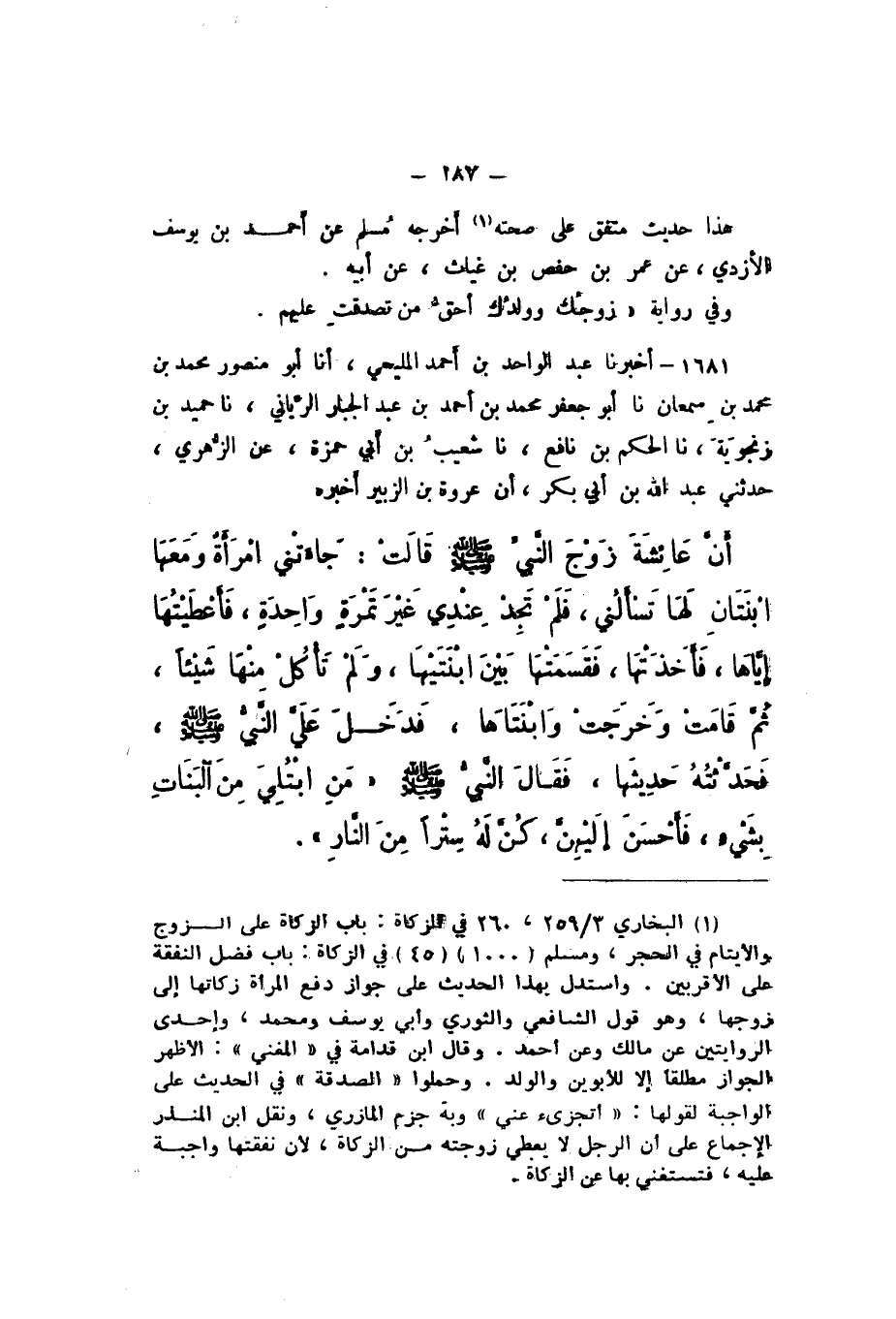 1681 - أَخْبَرَنَا عَبْدُ الْوَاحِدِ بْنُ أَحْمَدَ الْمَلِيحِيُّ، أَنا أَبُو مَنْصُورٍ مُحَمَّدُ بْنُ مُحَمَّدِ بْنِ سَمْعَانَ، نَا أَبُو جَعْفَرٍ مُحَمَّدُ بْنُ أَحْمَدَ بْنِ عَبْدِ الْجَبَّارِ الرَّيَّانِيُّ، نَا حُمَيْدُ بْنُ زَنْجُوَيْهِ، نَا الْحَكَمُ بْنُ نَافِعٍ، نَا شُعَيْبُ بْنُ أَبِي حَمْزَةَ، عَنِ الزُّهْرِيِّ، حَدَّثَنِي عَبْدُ اللَّهِ بْنُ أَبِي بَكْرٍ، أَنَّ عُرْوَةَ بْنَ الزُّبَيْر، أَخْبَرَهُ أَنَّ عَائِشَةَ زَوْجَ النَّبِيِّ صَلَّى اللهُ عَلَيْهِ وَسَلَّمَ، قَالَتْ: جَاءَتْنِي امْرَأَةٌ وَمَعَهَا ابْنَتَانِ لَهَا تَسْأَلُنِي، فَلَمْ تَجِدْ عِنْدِي غَيْرَ تَمْرَةٍ وَاحِدَةٍ، فَأَعْطَيْتُهَا إِيَّاهَا، فَأَخَذَتْهَا، فَقَسَّمَتْهَا بَيْنَ ابْنَتَيْهَا، ولَمْ تَأْكُلْ مِنْهَا شَيْئًا، ثُمَّ قَامَتْ وَخَرَجَتْ وَابْنَتَاهَا، فَدَخَلَ عَلَيَّ النَّبِيُّ صَلَّى اللهُ عَلَيْهِ وَسَلَّمَ، فَحَدَّثْتُهُ حَدِيثَهَا، فَقَالَ النَّبِيُّ صَلَّى اللهُ عَلَيْهِ وَسَلَّمَ: «مَنِ ابْتُلِيَ مِنَ الْبَنَاتِ بِشَيْءٍ، فَأَحْسَنَ إِلَيْهِنَّ، كُنَّ لَهُ سِتْرًا مِنَ النَّارِ».