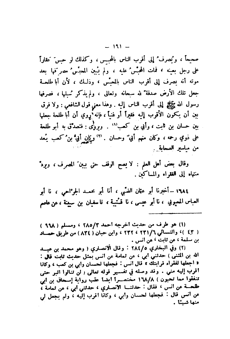 وَهَذَا مَعْنَى قَوْلِ الشَّافِعِيِّ: وَلا فَرْقَ بَيْنَ أَنْ يَكُونَ الْأَقْرَبُ إِلَيْهِ فَقِيرًا أَوْ غَنِيًّا، فَإِنَّهُ رُوِيَ أَنَّ أَبَا طَلْحَةَ جَعَلَهَا بَيْنَ حَسَّانِ بْنِ ثَابِتٍ، وَأُبَيِّ بْنِ كَعْبٍ، وَيُرْوَى: فَتَصَدَّقَ بِهِ أَبُو طَلْحَةَ عَلَى ذَوِي رَحِمِهِ، وَكَانَ مِنْهُمْ أُبَيٌّ وَحَسَّانٌ، وَكَانَ أُبَيُّ بْنُ كَعْبٍ يُعَدُّ مِنْ مَيَاسِيرِ الصَّحَابَةِ.
