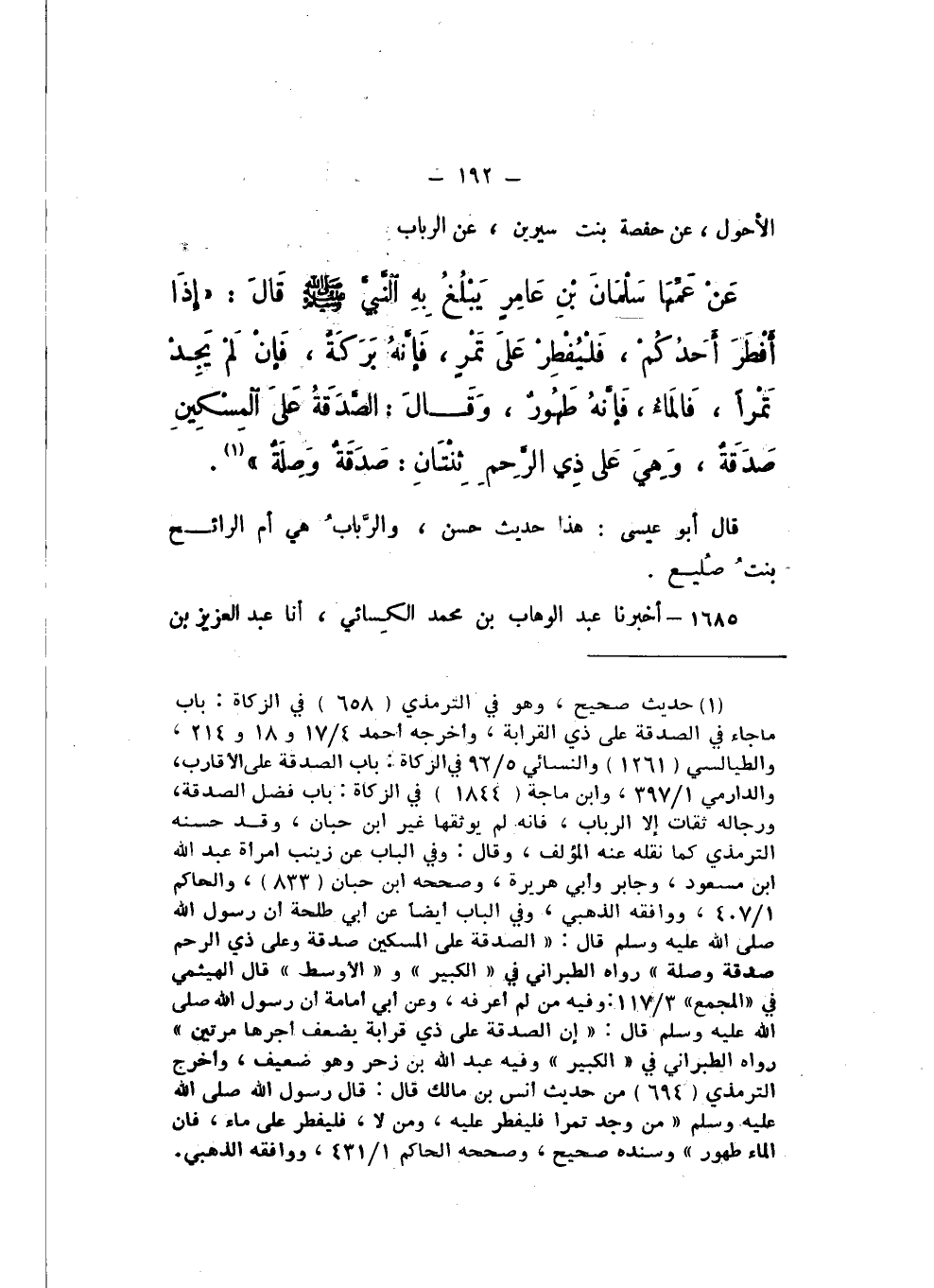 الْأَحْوَلِ، عَنْ حَفْصَةَ بِنْتِ سِيرِينَ، عَنِ الرَّبَابِ، عَنْ عَمِّهَا سَلْمَانَ بْنِ عَامِرٍ، يَبْلُغُ بِهِ النَّبِيَّ صَلَّى اللهُ عَلَيْهِ وَسَلَّمَ، قَالَ: " إِذَا أَفْطَرَ أَحَدُكُمْ، فَلْيُفْطِرْ عَلَى تَمْرٍ، فَإِنَّهُ بَرَكَةٌ، فَإِنْ لَمْ يَجِدْ تَمْرًا، فَالْمَاءُ، فَإنَّهُ طَهُورٌ، وَقَالَ: الصَّدَقَةُ عَلَى الْمِسْكِينِ صَدَقَةٌ، وَهِيَ عَلى ذِي الرَّحِمِ ثِنْتَانِ: صَدَقَةٌ، وَصِلَةٌ ".