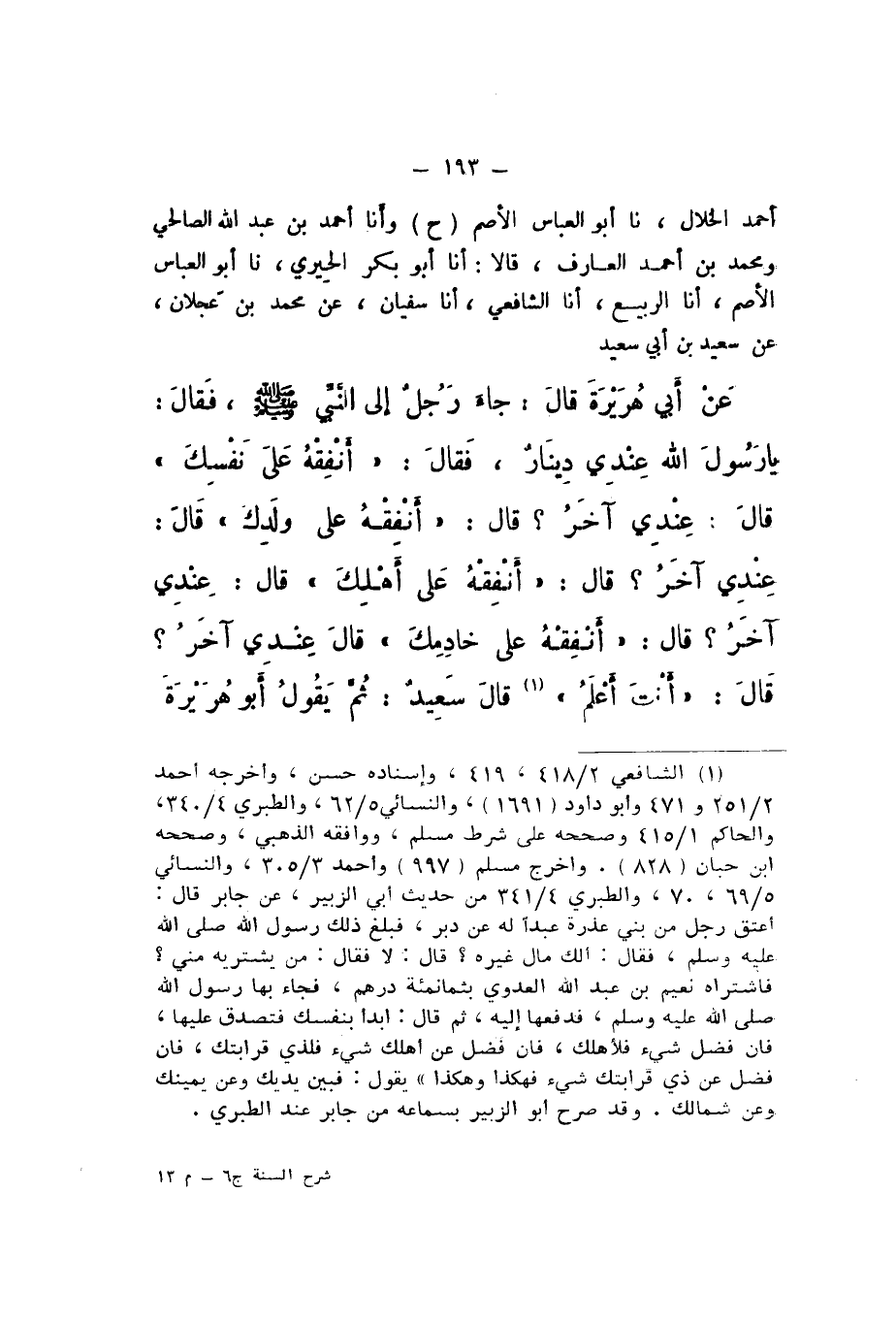 ح وَأَنَا أَحْمَدُ بْنُ عَبْدِ اللَّهِ الصَّالِحِيُّ، وَمُحَمَّدُ بْنُ أَحْمَدَ الْعَارِفُ، قَالا: أَنا أَبُو بَكْرٍ الْحِيرِيُّ، نَا أَبُو الْعَبَّاسِ الْأَصَمُّ، أَنا الرَّبِيعُ، أَنا الشَّافِعِيُّ، أَنا سُفْيَانُ، عَنْ مُحَمَّدِ بْنِ عَجْلانَ، عَنْ سَعِيدِ بْنِ أَبِي سَعِيدٍ، عَنْ أَبِي هُرَيْرَةَ، قَالَ: جَاءَ رَجُلٌ إِلَى النَّبِيِّ صَلَّى اللهُ عَلَيْهِ وَسَلَّمَ، فَقَالَ: يَا رَسُولَ اللَّهِ، عِنْدِي دِيَنارٌ، فَقَالَ: «أَنْفِقْهُ عَلَى نَفْسِكَ»، قَالَ: عِنْدِي آخَرُ؟ قَالَ: «أَنْفِقْهُ عَلَى ولَدِكَ»، قَالَ: عِنْدِي آخَرُ؟ قَالَ: «أَنْفِقْهُ عَلَى أَهْلِكَ»، قَالَ: عِنْدِي آخَرُ؟، قَالَ: «أَنْفِقْهُ عَلَى خَادِمِكَ»، قَالَ: عِنْدِي آخَرُ؟، قَالَ: «أَنْتَ أَعْلَمُ».