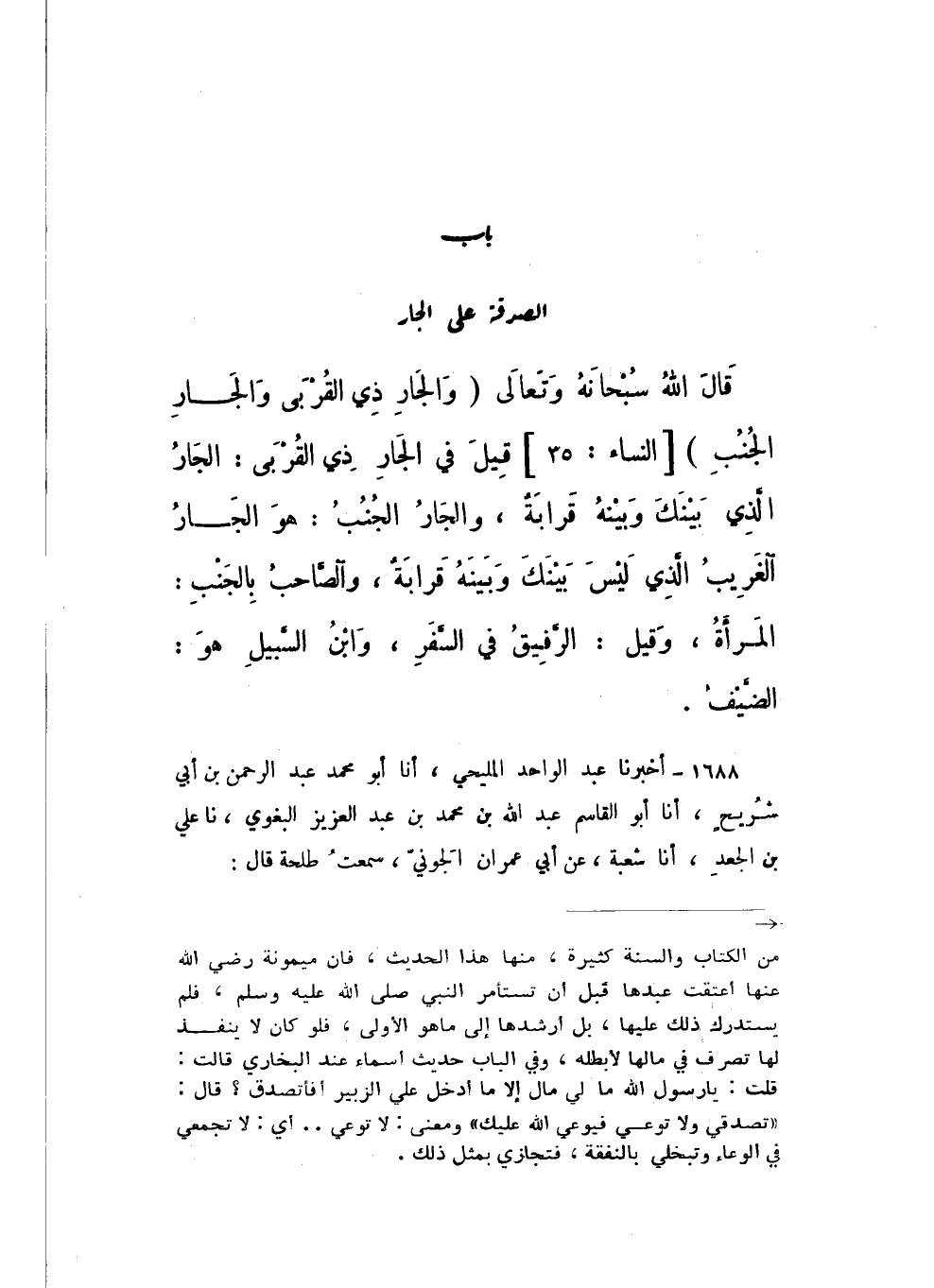 قَالَ اللَّهُ سُبْحَانَهُ وَتَعَالَى: {وَالْجَارِ ذِي الْقُرْبَى وَالْجَارِ الْجُنُبِ} [النِّسَاء: 36]، قِيلَ فِي الْجَارِ ذِي الْقُرْبَى: الْجَارُ الَّذِي بَيْنَكَ وَبَيْنَهُ قَرَابَةٌ، وَالْجَارُ الْجُنُبُ: هُوَ الْجَارُ الْغَرِيبُ الَّذِي لَيْسَ بَيْنَكَ وَبَيْنَهُ قَرَابَةٌ، وَالصَّاحِبُ بِالْجَنْبِ: الْمَرْأَةُ، وَقِيلَ: الرَّفِيقُ فِي السَّفَرِ، وَابْنُ السَّبِيلِ هُوَ الضَّيْفُ.