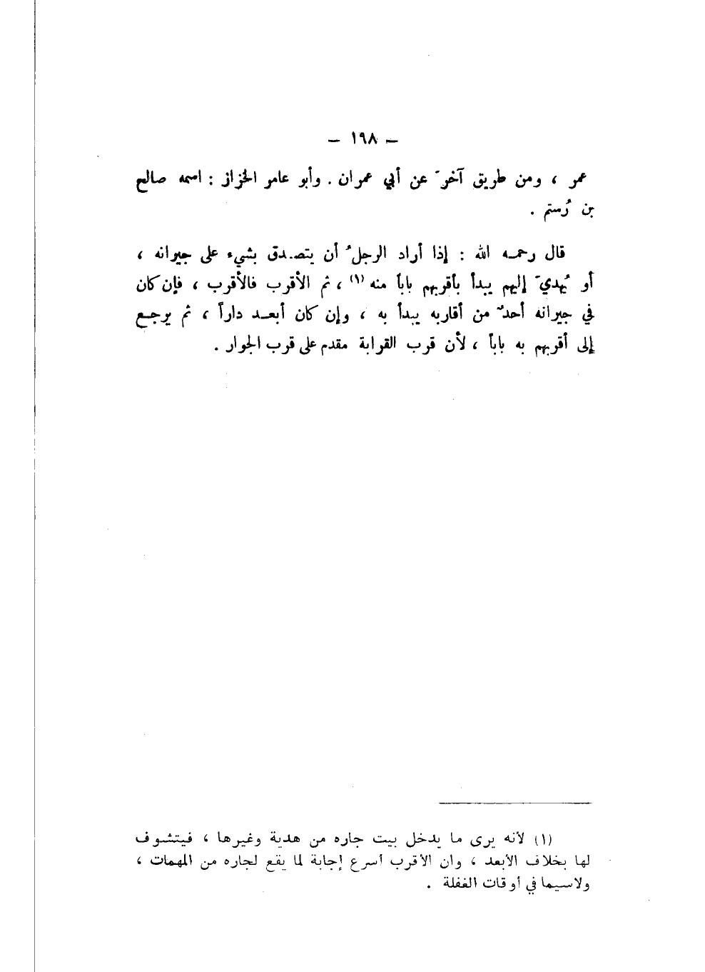 قَالَ رَحِمَهُ اللَّهُ: إِذَا أَرَادَ الرَّجُلُ أَنْ يَتَصَدَّقَ بِشَيْءٍ عَلَى جِيرَانِهِ، أَوْ يُهْدِيَ إِلَيْهِمْ يَبْدَأُ بِأَقْرَبِهِمْ بَابًا مِنْهُ، ثُمَّ الْأَقْرَبَ فَالْأَقْرَبِ، فَإِنْ كَانَ فِي جِيرَانِهِ أَحَدٌ مِنْ أَقَارِبِهِ يَبْدَأُ بِهِ، وَإِنْ كَانَ أَبْعَدَ دَارًا، ثُمَّ يَرْجِعُ إِلَى أَقْرَبِهِمْ بِهِ بَابًا؛ لِأَنَّ قُرْبَ الْقَرَابَةِ مُقَدَّمٌ عَلَى قُرْبِ الْجِوَارِ.
