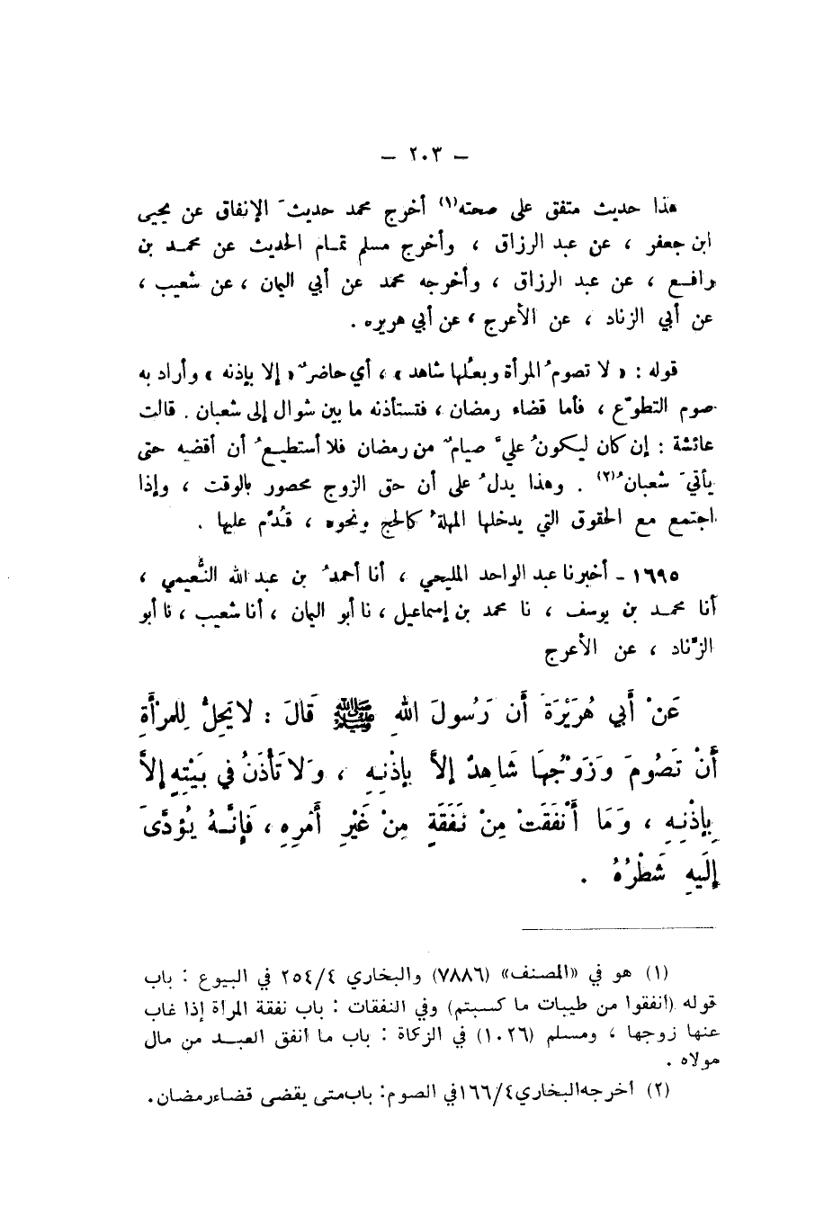 1695 - أَخْبَرَنَا عَبْدُ الْوَاحِدِ الْمَلِيحِيُّ، أَنا أَحْمَدُ بْنُ عَبْدِ اللَّهِ النُّعَيْمِيُّ، أَنا مُحَمَّدُ بْنُ يُوسُفَ، نَا مُحَمَّدُ بْنُ إِسْمَاعِيلَ، نَا أَبُو الْيَمَانِ، أَنا شُعَيْبٌ، نَا أَبُو الزِّنَادِ، عَنِ الْأَعْرَجِ، عَنْ أَبِي هُرَيْرَةَ، أَنّ رَسُولَ اللَّهِ صَلَّى اللهُ عَلَيْهِ وَسَلَّمَ، قَالَ: «لَا يَحِلُّ لِلْمَرْأَةِ أَنْ تَصُومَ وَزَوْجُهَا شَاهِدٌ إِلا بِإِذْنِهِ، وَلا تأْذَنُ فِي بَيْتِهِ إِلا بِإِذْنِهِ، وَمَا أَنْفَقَتْ مِنْ نَفَقَةٍ مِنْ غَيْرِ أَمْرِهِ، فَإِنَّهُ يُؤدَّى إِلَيْهِ شَطْرُهُ».