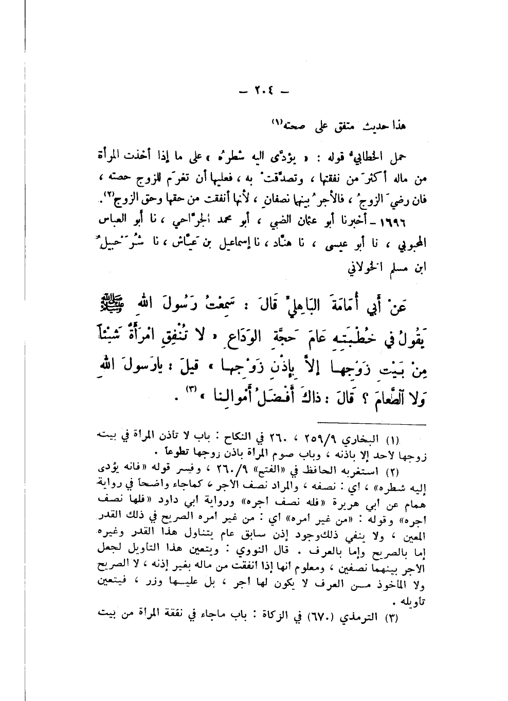1696 - أَخْبَرَنَا أَبُو عُثْمَانَ الضَّبِّيُّ، أَنا أَبُو مُحَمَّدٍ الْجَرَّاحِيُّ، نَا أَبُو الْعَبَّاسِ الْمَحْبُوبِيُّ، نَا أَبُو عِيسَى، نَا هَنَّادٌ، نَا إِسْمَاعِيلُ بْنُ عَيَّاشٍ، نَا شُرَحْبِيلُ بْنُ مُسْلِمٍ الْخَوْلانِيُّ، عَنْ أَبِي أُمَامَةَ الْبَاهِلِيِّ، قَالَ: سَمِعْتُ رَسُولَ اللَّهِ صَلَّى اللهُ عَلَيْهِ وَسَلَّمَ، يَقُولُ فِي خُطْبَتِهِ عَامَ حَجَّةِ الْوَدَاعِ: «لَا تُنْفِقِ امْرَأَةٌ شَيْئًا مِنْ بَيْتِ زَوْجِهَا إِلا بِإِذْنِ زَوْجِهَا»، قِيلَ: يَا رَسُولَ اللَّهِ، وَلا الطَّعَامَ؟ قَالَ: «ذَاكَ أَفْضَلُ أَمْوَالِنَا».