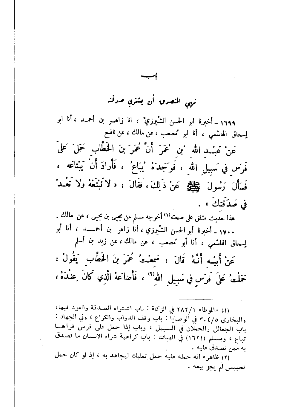 1699 - أَخْبَرَنَا أَبُو الْحَسَنِ الشِّيرَزِيُّ، أَنا زَاهِرُ بْنُ أَحْمَدَ، أَنا أَبُو إِسْحَاقَ الْهَاشِمِيُّ، أَنا أَبُو مُصْعَبٍ، عَنْ مَالِكٍ، عَنْ نَافِعٍ، عَنْ عَبْدِ اللَّهِ بْنِ عُمَرَ، أَنَّ عُمَرَ بْنَ الْخَطَّابِ حَمَلَ عَلَى فَرَسٍ فِي سَبيلِ اللَّهِ، فَوَجَدَهُ يُبَاعُ، فَأَرَادَ أَنْ يَبْتَاعَهُ، فَسَأَلَ رَسُولَ صَلَّى اللهُ عَلَيْهِ وَسَلَّمَ عَنْ ذَلِكَ، فَقَالَ: «لَا تَبْتَعْهُ، وَلا تَعُدْ فِي صَدَقَتِكَ».
