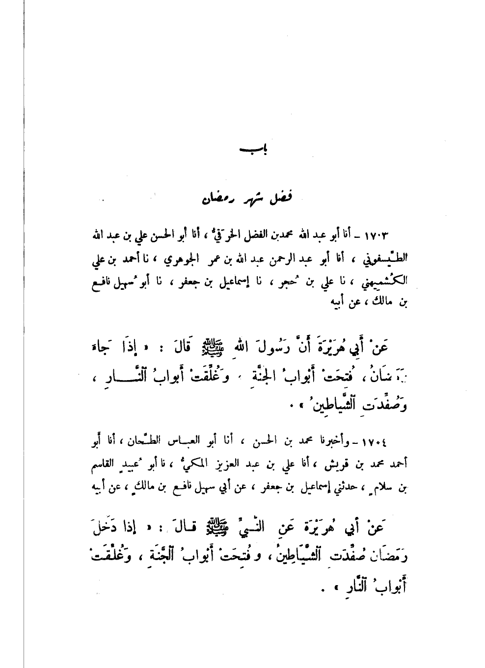 1704 - وَأَخْبَرَنَا مُحَمَّدُ بْنُ الْحَسَنِ، أَنا أَبُو الْعَبَّاسِ الطَّحَّانُ، أَنا أَبُو أَحْمَدَ مُحَمَّدُ بْنُ قُرَيْشٍ، أَنا عَلِيُّ بْنُ عَبْدِ الْعَزِيزِ الْمَكِّيُّ، نَا أَبُو عُبَيْدٍ الْقَاسِمُ بْنُ سَلامٍ، حَدَّثَنِي إِسْمَاعِيلُ بْنُ جَعْفَرٍ، عَنْ أَبِي سُهَيْلٍ نَافِعِ بْنِ مَالِكٍ، عَنْ أَبِيهِ، عَنْ أَبِي هُرَيْرَةَ، عَنِ النَّبِيِّ صَلَّى اللهُ عَلَيْهِ وَسَلَّمَ، قَالَ: «إِذَا دَخَلَ رَمَضَانُ صُفِّدَتِ الشَّيَاطِينُ، وَفُتِحَتْ أَبْوَابُ الْجَنَّةِ، وَغُلِّقَتْ أَبْوَابُ النَّارِ».