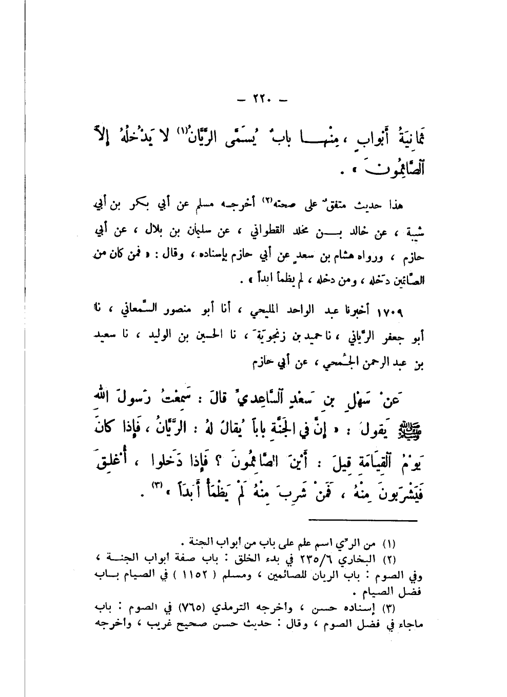 1709 - أَخْبَرَنَا عَبْدُ الْوَاحِدِ الْمَلِيحِيُّ، أَنا أَبُو مَنْصُورٍ السَّمْعَانِيُّ، نَا أَبُو جَعْفَرٍ الرَّيَّانِيُّ، نَا حُمَيْدُ بْنُ زَنْجُوَيْهِ، نَا الْحُسَيْنُ بْنُ الْوَلِيدِ، نَا سَعِيدُ بْنُ عَبْدِ الرَّحْمَنِ الْجُمَحِيُّ، عَنْ أَبِي حَازِمٍ، عَنْ سَهْلِ بْنِ سَعْدٍ السَّاعِدِيِّ، قَالَ: سَمِعْتُ رَسُولَ اللَّهِ صَلَّى اللهُ عَلَيْهِ وَسَلَّمَ، يَقُولُ: " إِنَّ فِي الْجَنَّةِ بَابًا، يُقَالُ لَهُ: الرَّيَّانُ، فَإِذَا كَانَ يَوْمُ الْقِيَامَةِ، قِيلَ: أَيْنَ الصَّائِمُونَ؟ فَإذَا دَخَلُوا، أُغْلِقَ، فَيَشْرَبُونَ مِنْهُ، فَمَنْ شَرِبَ مِنْهُ لَمْ يَظْمَأْ أَبَدًا ".