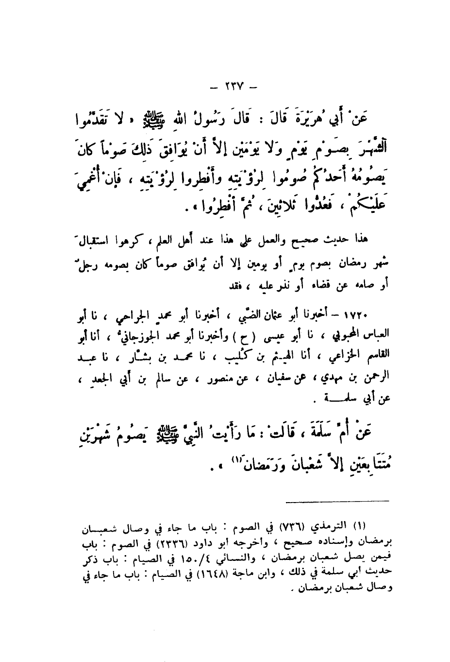 وَالْعَمَلُ عَلَى هَذَا عِنْدَ أَهْلِ الْعِلْمِ، كَرِهُوا اسْتِقْبَالَ شَهْرِ رَمَضَانَ بِصَوْمِ يَوْمٍ أَوْ يَوْمَيْنِ إِلا أَنْ يُوَافِقَ صَوْمًا كَانَ يَصُومُهُ رَجُلٌ، أَوْ صَامَهُ عَنْ قَضَاءٍ، أَوْ نَذْرٍ عَلَيْهِ، فَقَدْ