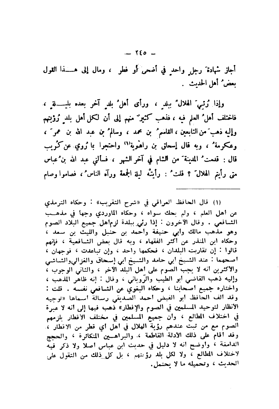 وَإِذَا رُئِيَ الْهِلالُ بِبَلَدٍ، وَرَأَى أَهْلُ بَلَدٍ آخَرَ بَعْدَهُ بِلَيْلَةٍ، فَاخْتَلَفَ أَهْلُ الْعِلْمِ فِيهِ، فَذَهَبَ كَثِيرٌ مِنْهُمْ إِلَى أَنَّ لِكُلِّ أَهْلِ بَلَدٍ رُؤْيَتَهُمْ، وَإِلَيْهِ ذَهَبَ مِنَ التَّابِعِينَ، الْقَاسِمُ بْنُ مُحَمَّدٍ، وَسَالِمُ بْنُ عَبْدِ اللَّهِ بْنِ عُمَرَ، وَعِكْرِمَةُ، وَبِهِ قَالَ إِسْحَاقُ بْنُ رَاهَوَيْهِ، وَاحْتَجُّوا بِمَا رُوِيَ عَنْ كُرَيْبٍ، قَالَ: قَدِمْتُ الْمَدِينَةَ مِنَ الشَّامِ فِي آخِرِ الشَّهْرِ، فَسَأَلَنِي عَبْدُ اللَّهِ بْنُ عَبَّاسٍ، مَتَى رَأَيْتُمُ الْهِلالَ؟ قُلْتُ: رَأَيْتُهُ لَيْلَةَ الْجُمُعَةِ وَرَآهُ النَّاسُ.
