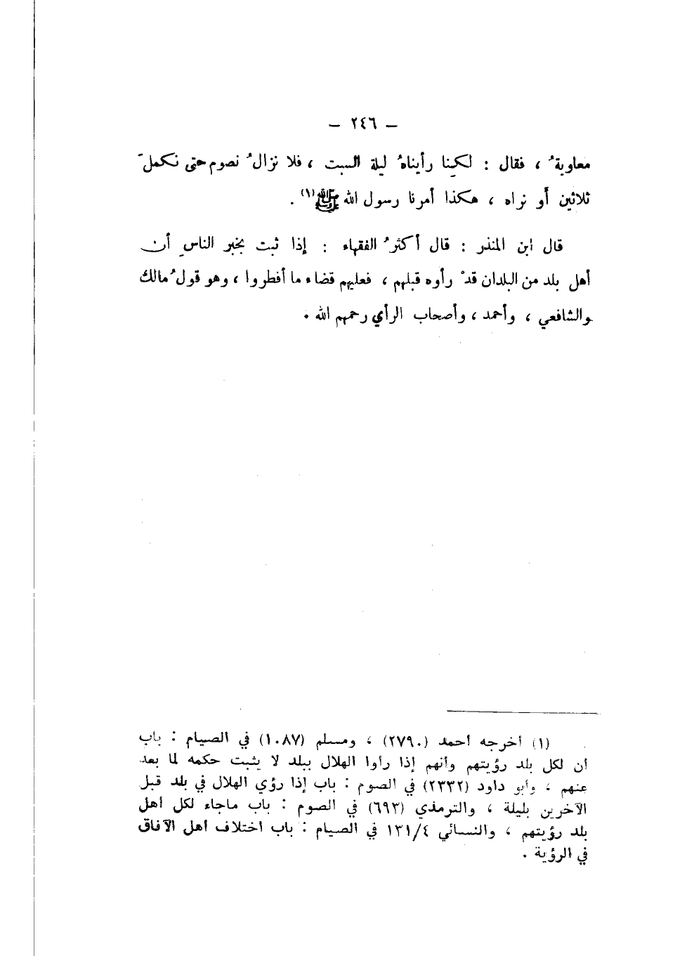 مُعَاوِيَةُ، فَقَالَ: لَكِنَّا رَأَيْنَاهُ لَيْلَةَ السَّبْتِ، فَلا نَزَالُ نَصُومُ حَتَّى نُكْمِلَ ثَلاثِينَ أَوْ نَرَاهُ، هَكَذَا أَمَرَنَا رَسُولُ اللَّهِ صَلَّى اللهُ عَلَيْهِ وَسَلَّمَ.