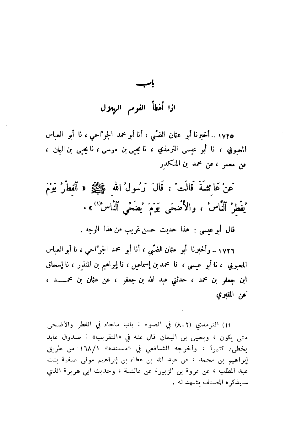 1725 - أَخْبَرَنَا أَبُو عُثْمَانَ الضَّبِّيُّ، أَنا أَبُو مُحَمَّدٍ الْجَرَّاحِيُّ، نَا أَبُو الْعَبَّاسِ الْمَحْبُوبِيُّ، نَا أَبُو عِيسَى التِّرْمِذِيُّ، نَا يَحْيَى بْنُ مُوسَى، نَا يَحْيَى بْنُ الْيَمَانِ، عَنْ مَعْمَرٍ، عَنْ مُحَمَّدِ بْنِ الْمُنْكَدِرِ، عَنْ عَائِشَةَ، قَالَتْ: قَالَ رَسُولُ اللَّهِ صَلَّى اللهُ عَلَيْهِ وَسَلَّمَ: «الْفِطْرُ يَوْمَ يُفْطِرُ النَّاسُ، وَالْأَضْحَى يَوْمَ يُضَحِّي النَّاسُ».