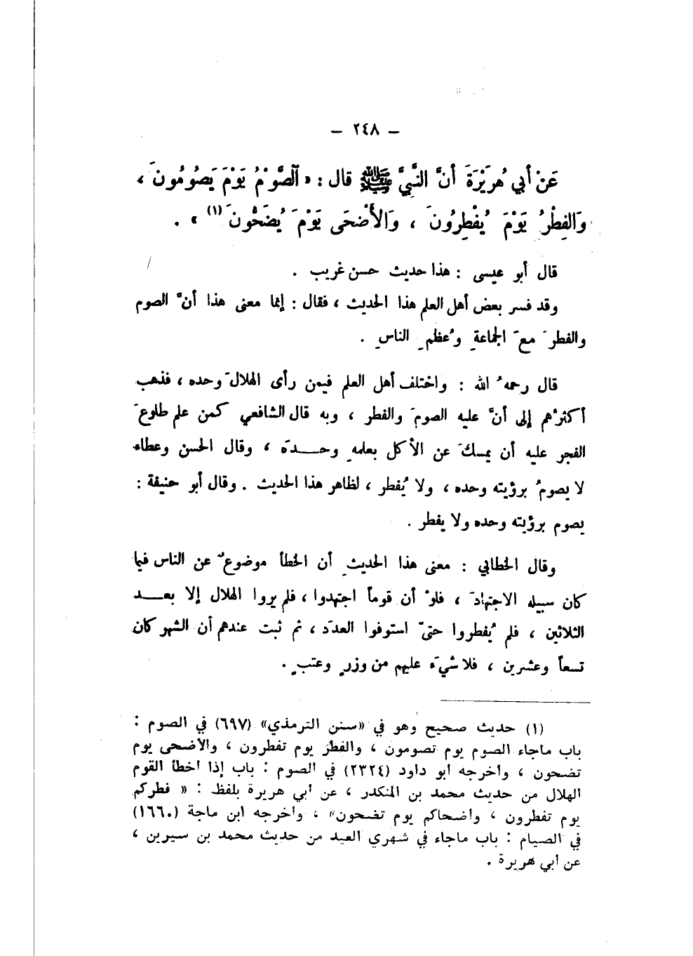 عَنْ أَبِي هُرَيْرَةَ، أَنّ النَّبِيَّ صَلَّى اللهُ عَلَيْهِ وَسَلَّمَ، قَالَ: «الصَّوْمُ يَوْمَ يَصُومُونَ، وَالْفِطْرُ يَوْمَ يُفْطِرُونَ، وَالْأَضْحَى يَوْمَ يُضَحُّونَ».