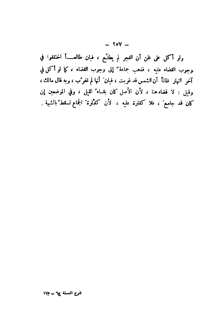 وَلَوْ أَكَلَ عَلَى ظَنِّ أَنَّ الْفَجْرَ لَمْ يَطْلُعْ، فَبَانَ طَالِعًا، اخْتَلَفُوا فِي وُجُوبِ الْقَضَاءِ عَلَيْهِ، فَذَهَبَ جَمَاعَةٌ إِلَى وُجُوبِ الْقَضَاءِ، كَمَا لَوْ أَكَلَ فِي آخِرِ النَّهَارِ ظَانًّا أَنَّ الشَّمْسَ قَدْ غَرَبَتْ، فَبَانَ أَنَّهَا لَمْ تَغْرُبْ، وَبِهِ قَالَ مَالِكٌ، وَقِيلَ: لَا قَضَاءَ هُنَا؛ لأَنَّ الْأَصْلَ كَانَ بَقَاءَ اللَّيْلِ، وَفِي الْمَوْضِعَيْنِ إِنْ كَانَ قَدْ جَامَعَ، فَلا كَفَّارَةَ عَلَيْهِ؛ لأَنَّ كَفَّارَةَ الْجِمَاعِ تَسْقُطُ بِالشُّبْهَةِ.