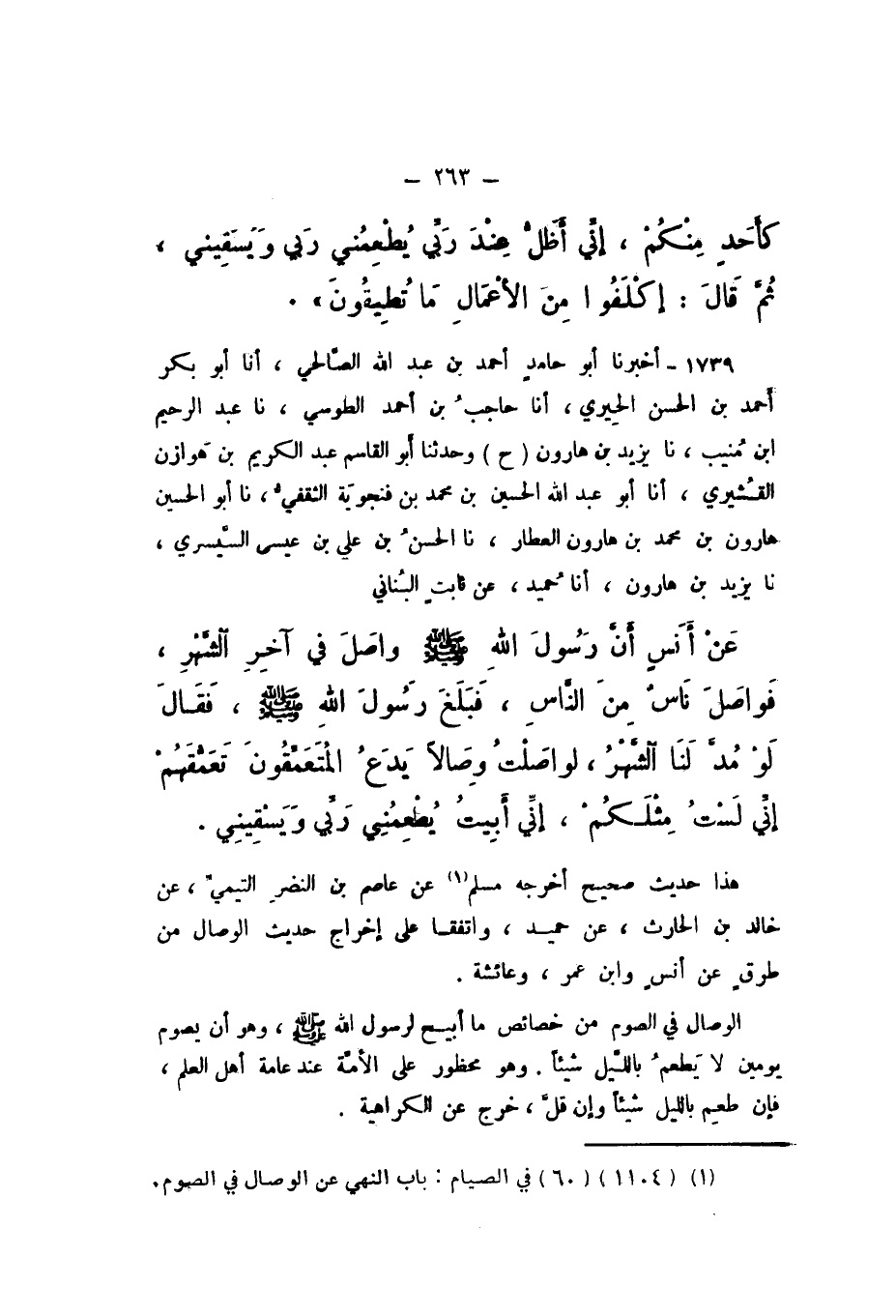 هَذَا حَدِيثٌ صَحِيحٌ، أَخْرَجَهُ مُسْلِمٌ، عَنْ عَاصِمِ بْنِ النَّضْرِ التَّيْمِيِّ، عَنْ خَالِدِ بْنِ الْحَارِثِ، عَنْ حُمَيْدٍ، وَاتَّفَقَا عَلَى إِخْرَاجِ حَدِيثِ الْوِصَالِ مِنْ طُرُقٍ عَنْ أَنَسٍ، وَابْنِ عُمَرَ، وَعَائِشَةَ