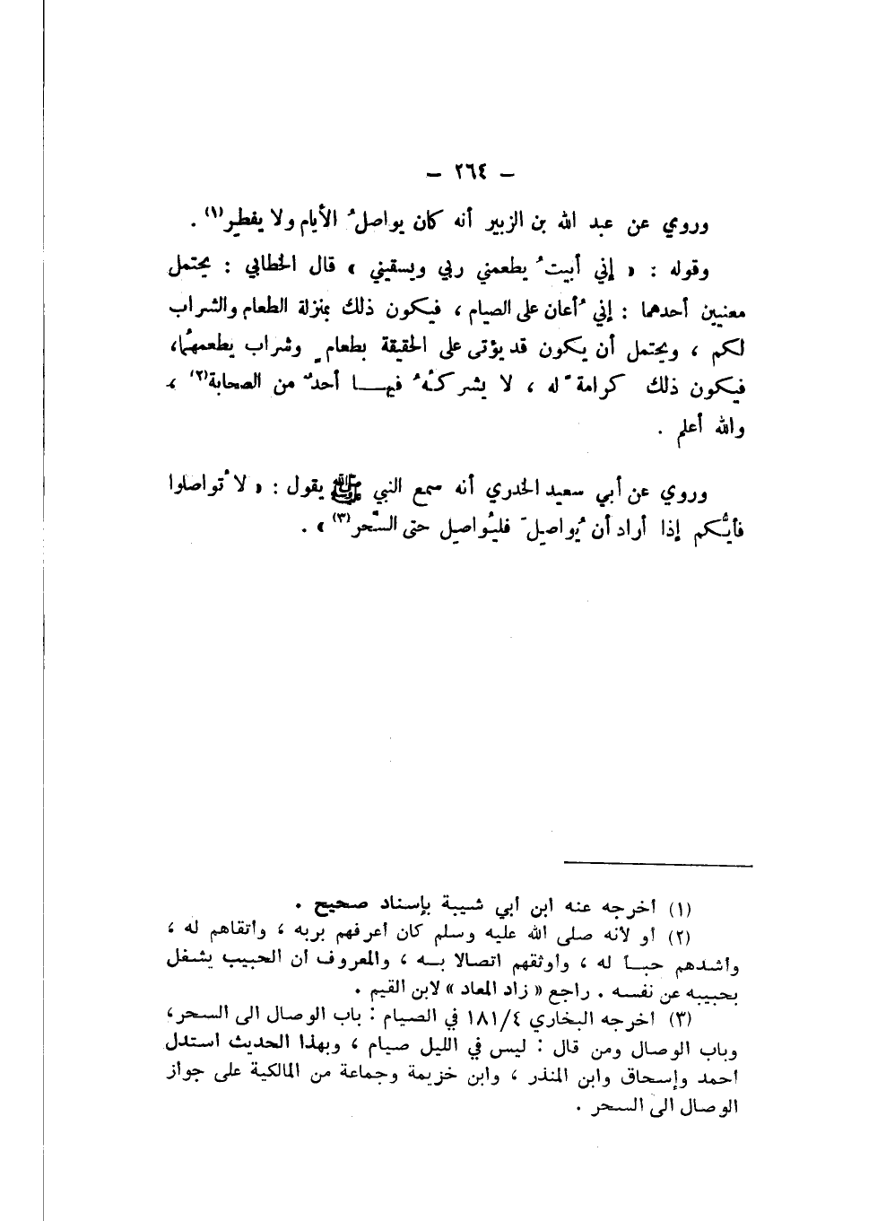 وَرُوِيَ عَنْ أَبِي سَعِيدٍ الْخُدْرِيِّ، أَنَّهُ سَمِعَ النَّبِيَّ صَلَّى اللهُ عَلَيْهِ وَسَلَّمَ، يَقُولُ: «لَا تُوَاصِلُوا، فَأَيُّكُمْ إِذَا أَرَادَ أَنْ يُوَاصِلَ فَلْيُوَاصِلْ حَتَّى السَّحَرِ».